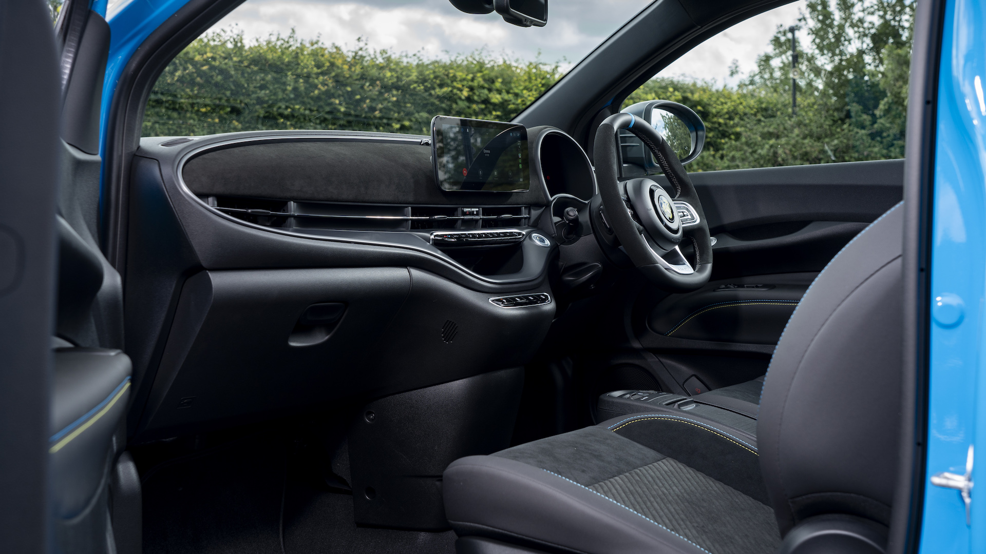 As with the old petrol-powered 500, the Convertible part of this Abarth is really more of a full-length fabric sunroof. It does fold a long way back — all the way to the top of the boot — but the framed doors and roof rails stay in place, so it’s not fully open. That said, it’s enough to be getting on with, and the bonus is that you can put it up or down at speed, allowing you to take advantage of the sunny spells between the showers.