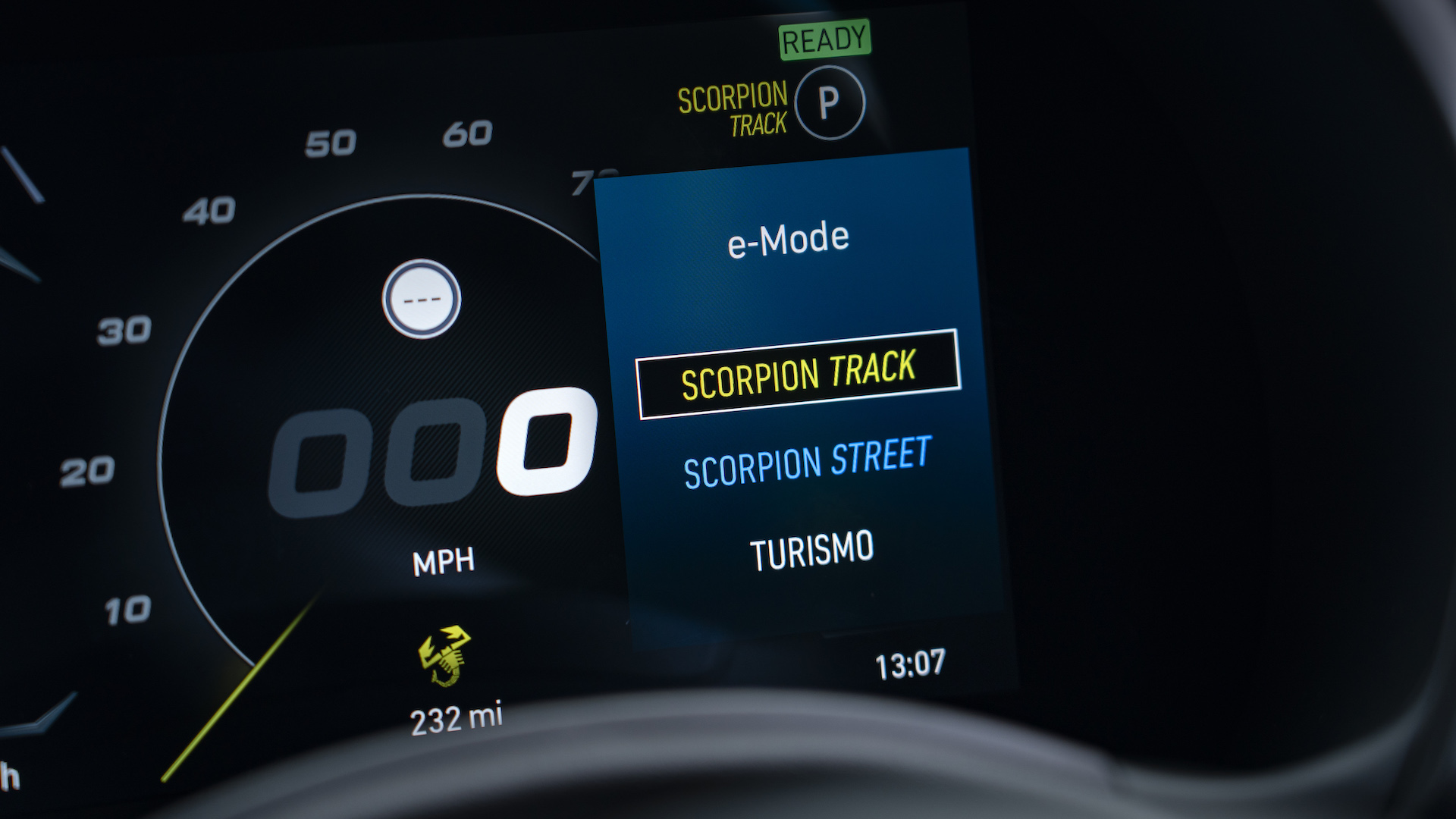 Then there’s the noise. Abarths are famed for their crackling, noisy exhaust but an electric car is all about silent humming, right? Wrong — the 500e Convertible gets an external speaker which simulates a grumbling engine sound. It’s a bit cheesy — some people absolutely hate it — but as a first try at making EVs a bit more aurally engaging, it’s at least an interesting effort. (And you can turn it off if it’s not for you.)