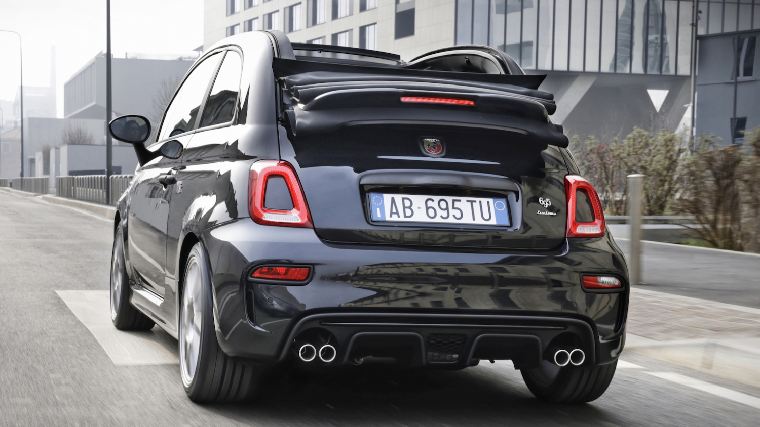The Abarth 695C is the convertible sibling to the 695 hot hatch, so rather than a solid roof, you get a sliding soft-top to enjoy the pops and bangs from the upgraded exhaust.