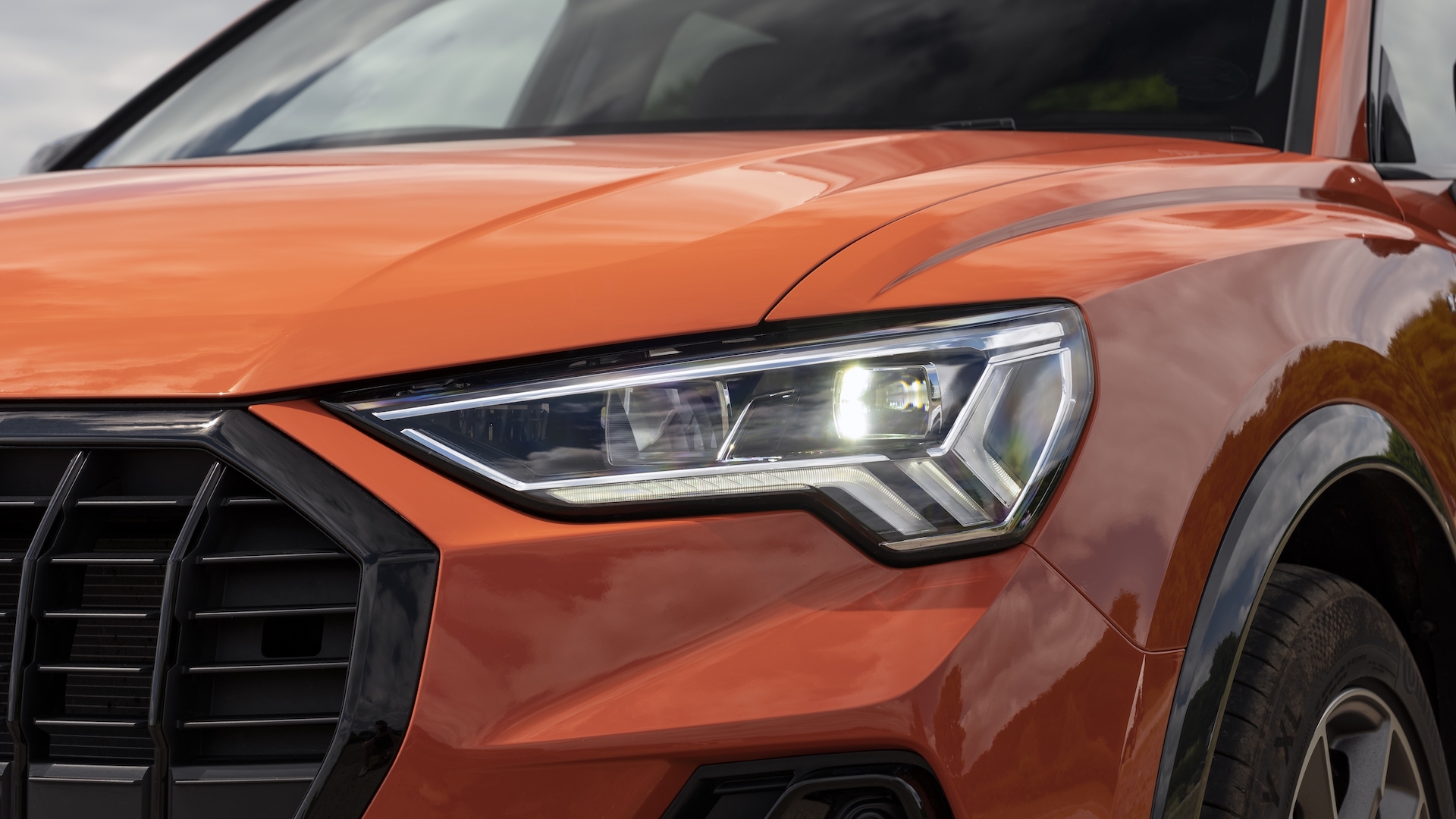 There’s no doubt the Audi Q3 has been inspired by the vast Q8 SUV – that giant grille, for example, makes it look just like a toddler that’s trying on its Grandparent’s dentures