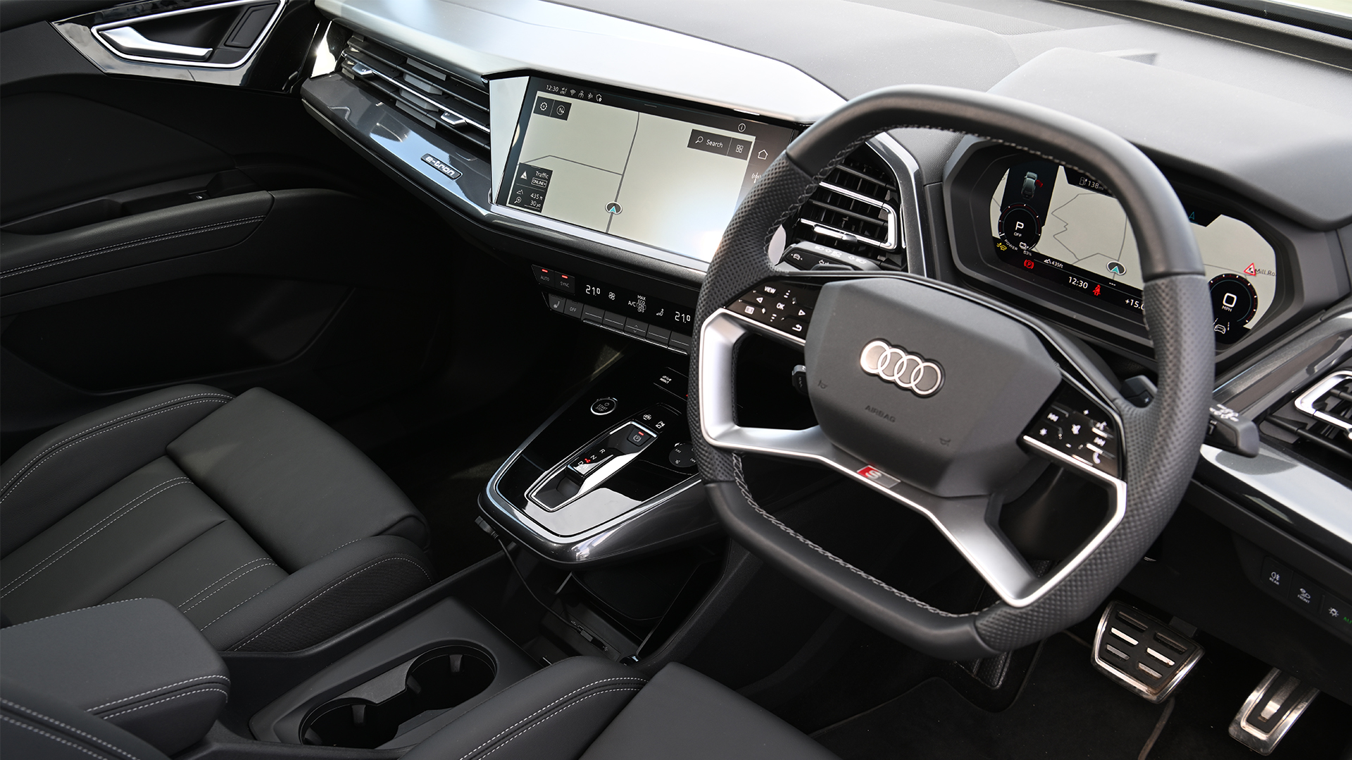 Space in the front is really good, and it’s easy to find a comfortable driving position. The Q4 isn’t as tall as other SUVs, but you can set the seat right up to get a good view of the road ahead.
