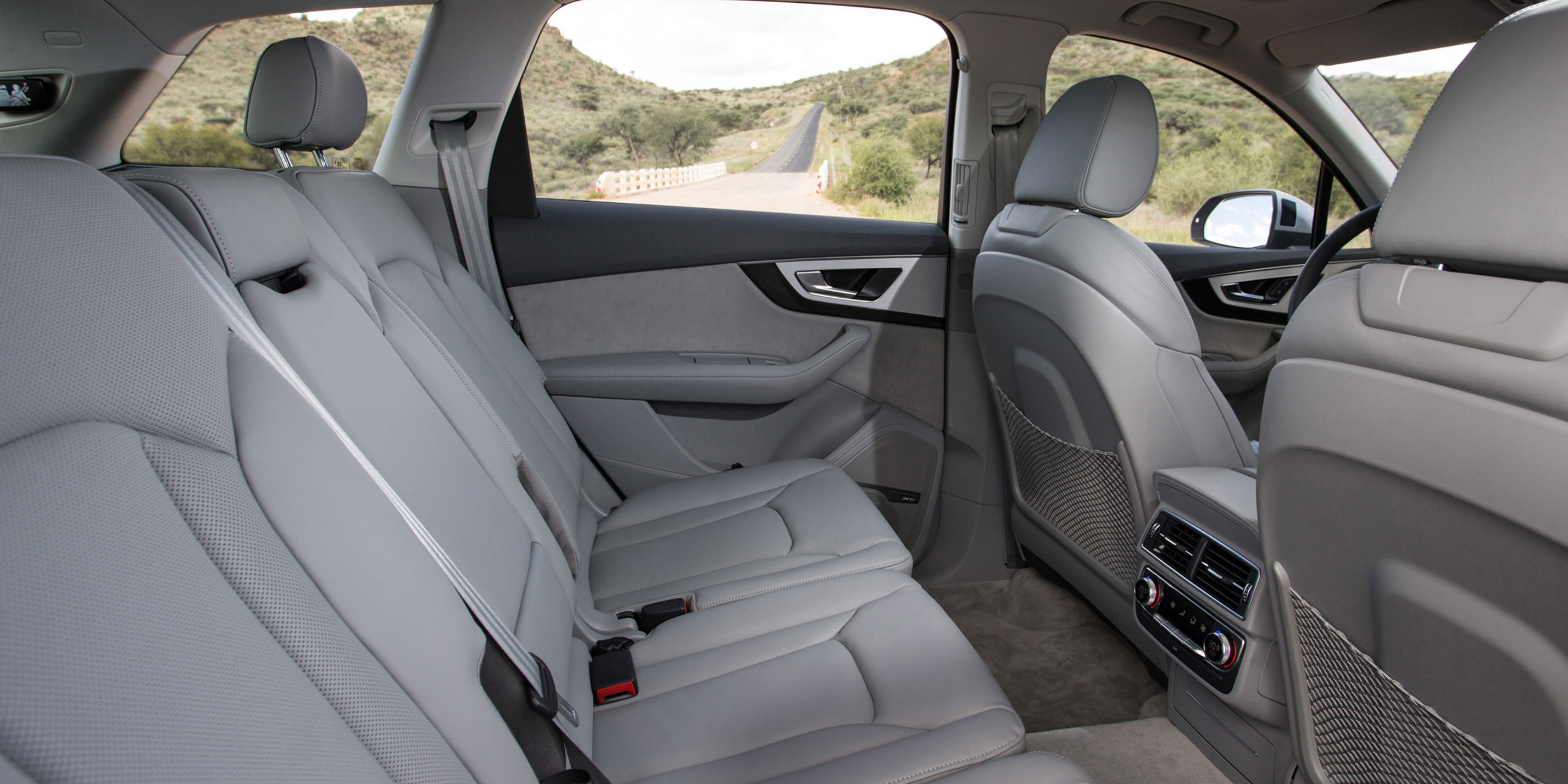 It’s even reasonably spacious with three people sitting in the second row. The Audi Q7’s width means there’s plenty of space for your passengers’ shoulders, the middle seat is supportive and the car’s large footwells ensure there is room for everyone’s feet.