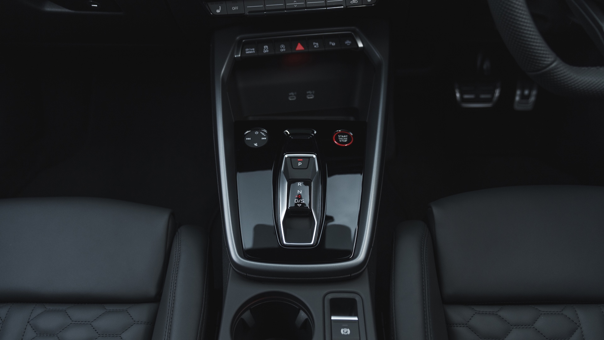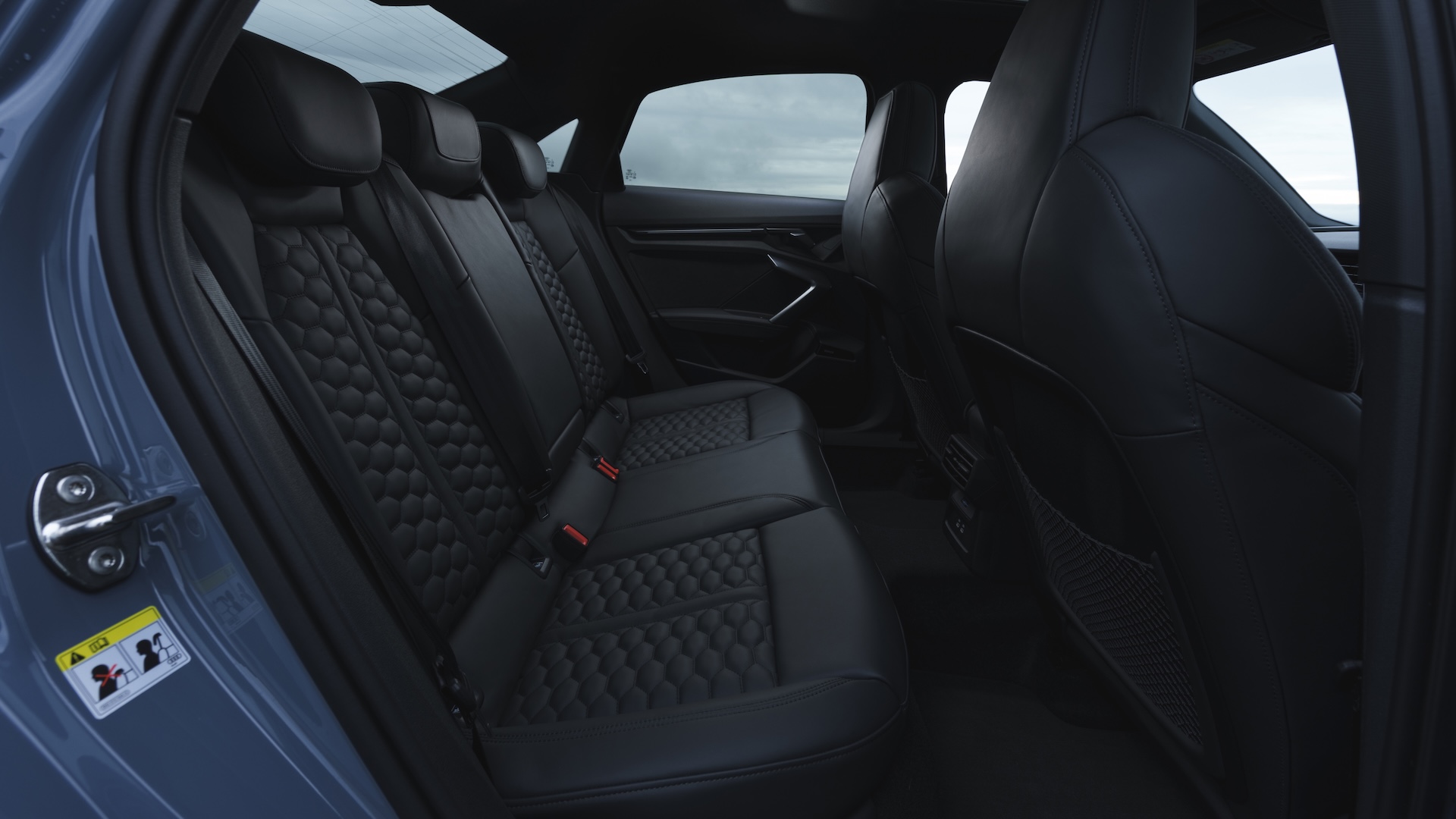 It’s spacious up front, too, with comfortable seats and decent storage space for smaller items in the door bins, centre cubby between the seats and the wireless charging trough under the dashboard. The rear seats are lacking in headroom, though, as the low roofline robs you of space compared to the RS3 Sportback.