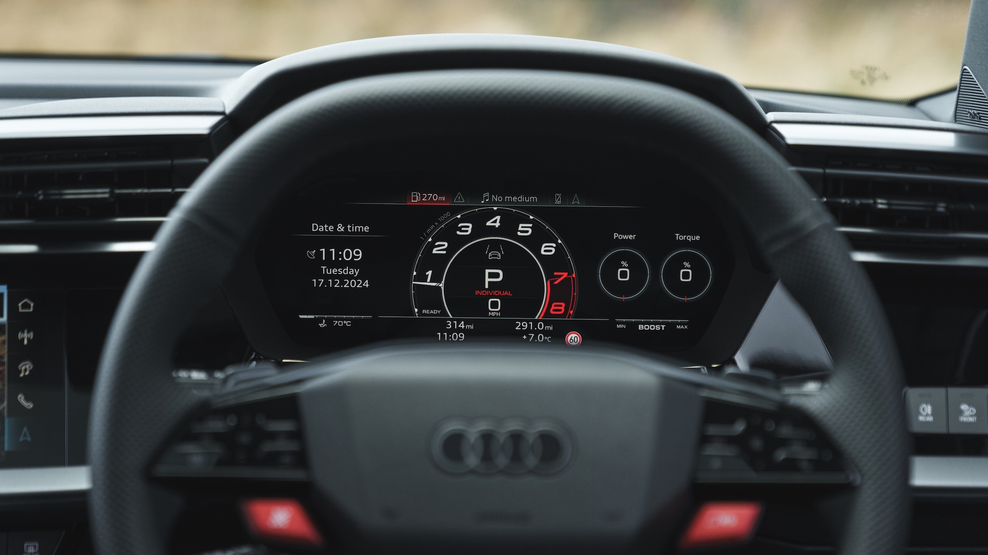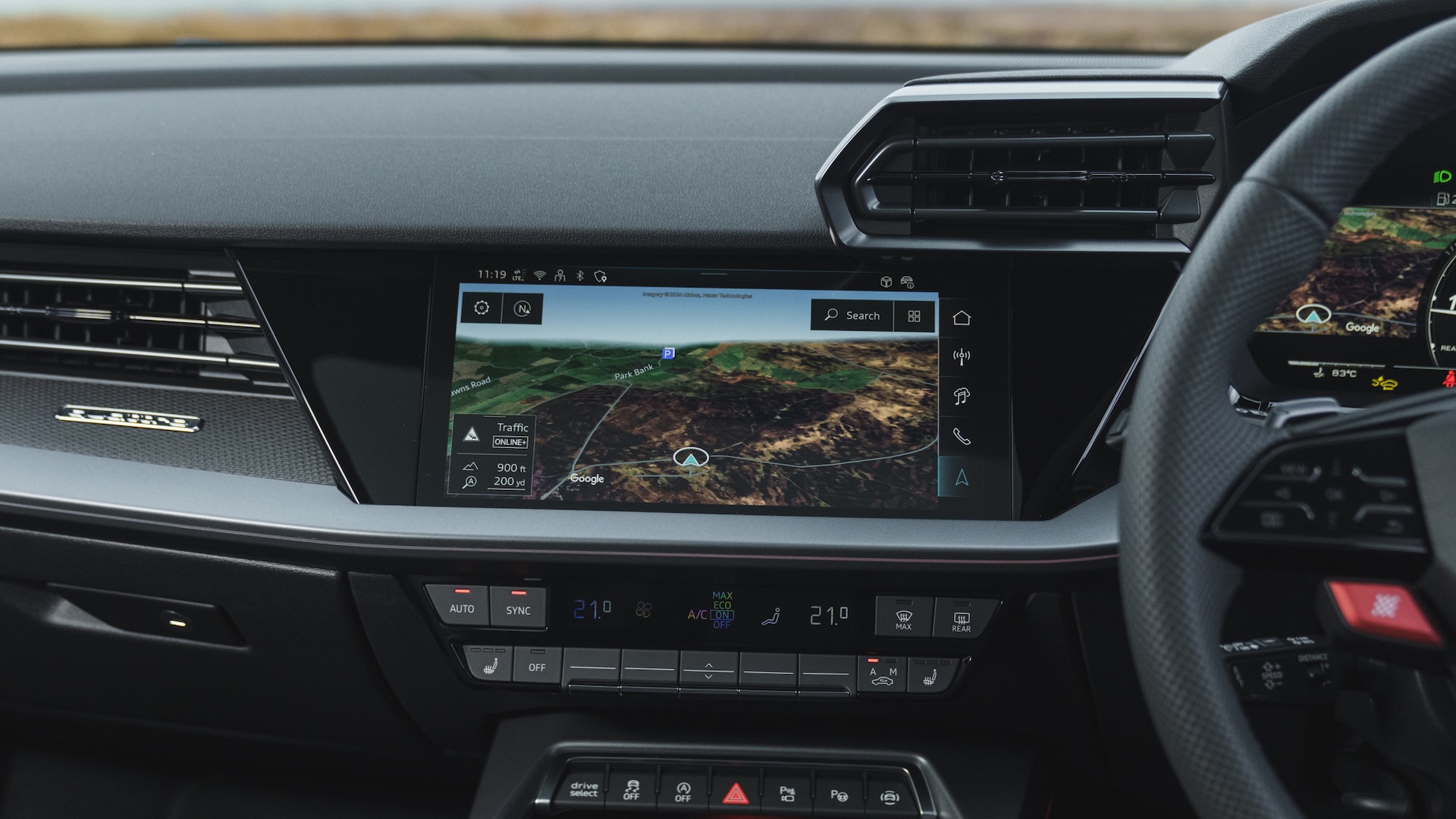 Thankfully, the RS3 has avoided Audi’s latest interior - not because the new one is unpleasant, but the previous-generation cabin is far better made with plusher materials. You get a dashboard full of sharp lines and angular creases, with funky air vents mounted up-high either side of the 12.3-inch instrument display.