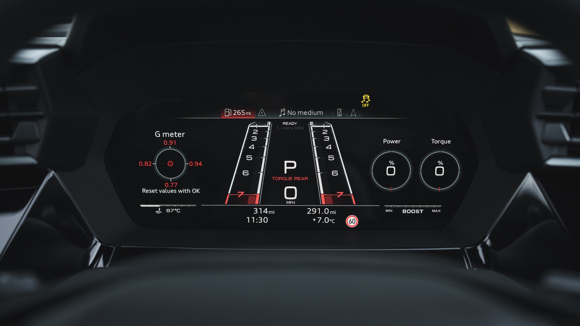 Speaking of which, you get RS-specific graphics which are moodier and sportier to look at than a regular Audi, especially when you chuck the car in ‘RS’ mode by pressing the achingly-cool satin red button on the steering wheel.