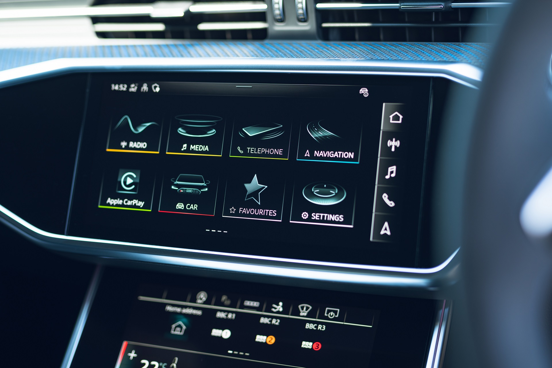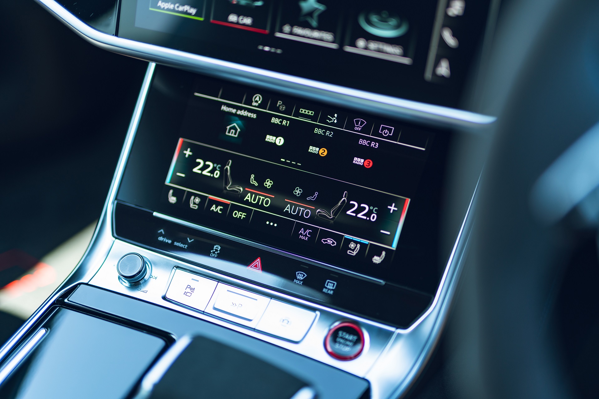 As with the RS6 and many other Audis, the infotainment system is split across two screens — one for maps, music, and anything else and one for the climate control. This is sensible in some ways, as at least you can always find your climate controls quickly, but the haptic touchscreen just isn’t as intuitive nor as simple to use as physical buttons, so can become annoying. The screens and menus are also a little on the dark side.