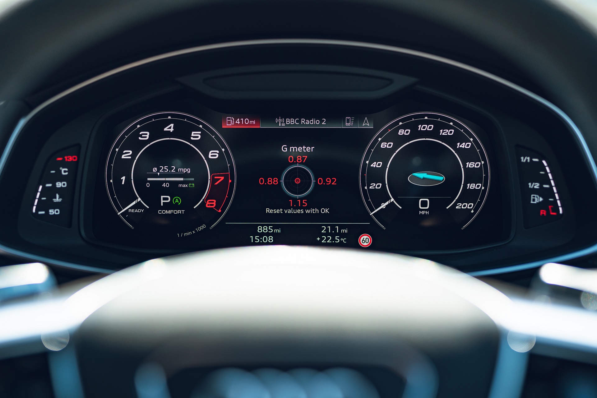 That’s true of the digital instruments too, but at least they’re clear and pretty simple. That is until you activate one of the RS driving modes. These, RS1 and RS2, can be pre-set and quickly selected so that you can have one setting that’s all about comfort and ease, and one that turns everything up to sporty-11, and flick between the two whenever you want to. That’s great, and rather like BMW’s similar M1 and M2 buttons, but the downside is that Audi has given both RS modes a unique layout for the digital instruments which makes them look like a duff Gameboy screen from the 1990s. Why?