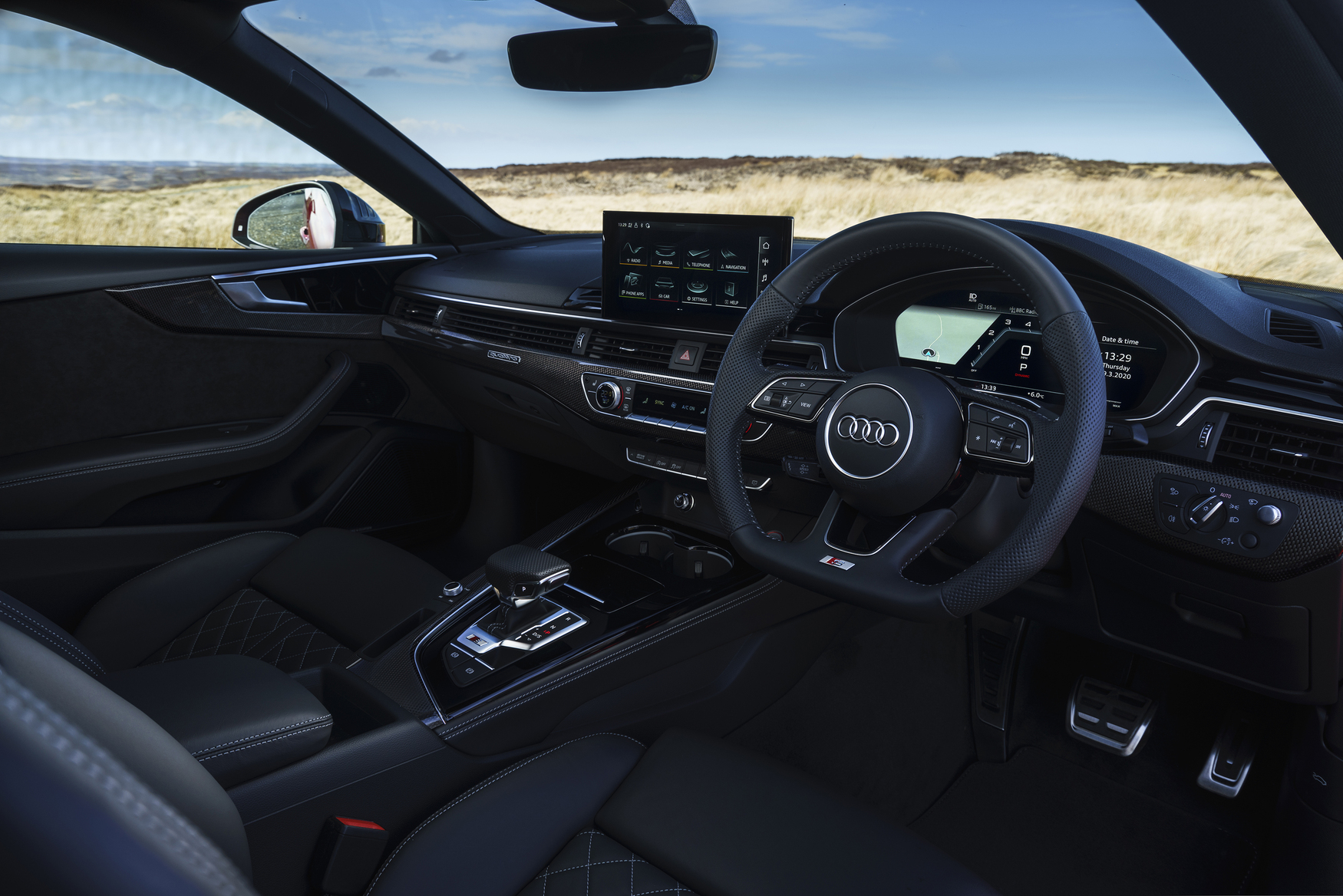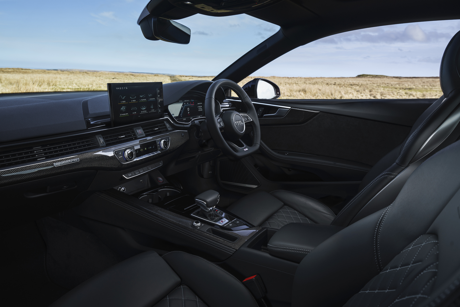 Inside, Audi has followed a similar theme, so the basic A5 cabin is smartened up by the addition of a flat-bottomed steering wheel, leather-Alcantara sports seats, and the choice of carbon fibre or aluminium trim.