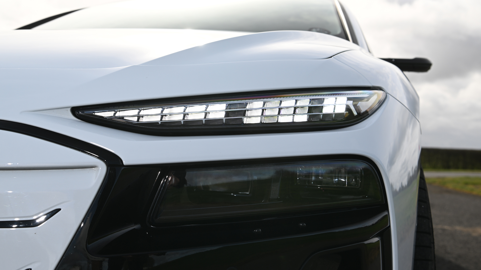 The Audi S6 Avant e-tron’s OLED lights, front and rear, aren’t just super-bright, and don’t just come with adaptive high beams, but they also have ‘car-to-X’ technology, which means that they can flash warning symbols to cars behind you if there’s information on an accident or slippery surface ahead.