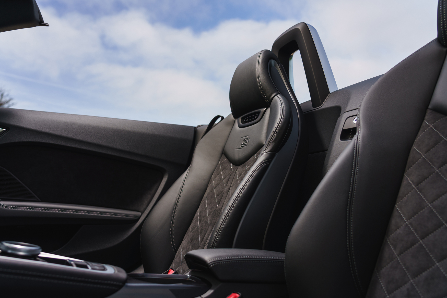 In standard Sport guise, the latest Audi TT Roadster comes in some new paint colours and with some chunkier side skirts than the old car. If that all seems a bit subtle, you should consider upgrading to an S-Line or Black Edition model to get some bigger alloy wheels and the same ground-hugging bumpers as the faster TTS Roadster with some neat contrasting air intakes.