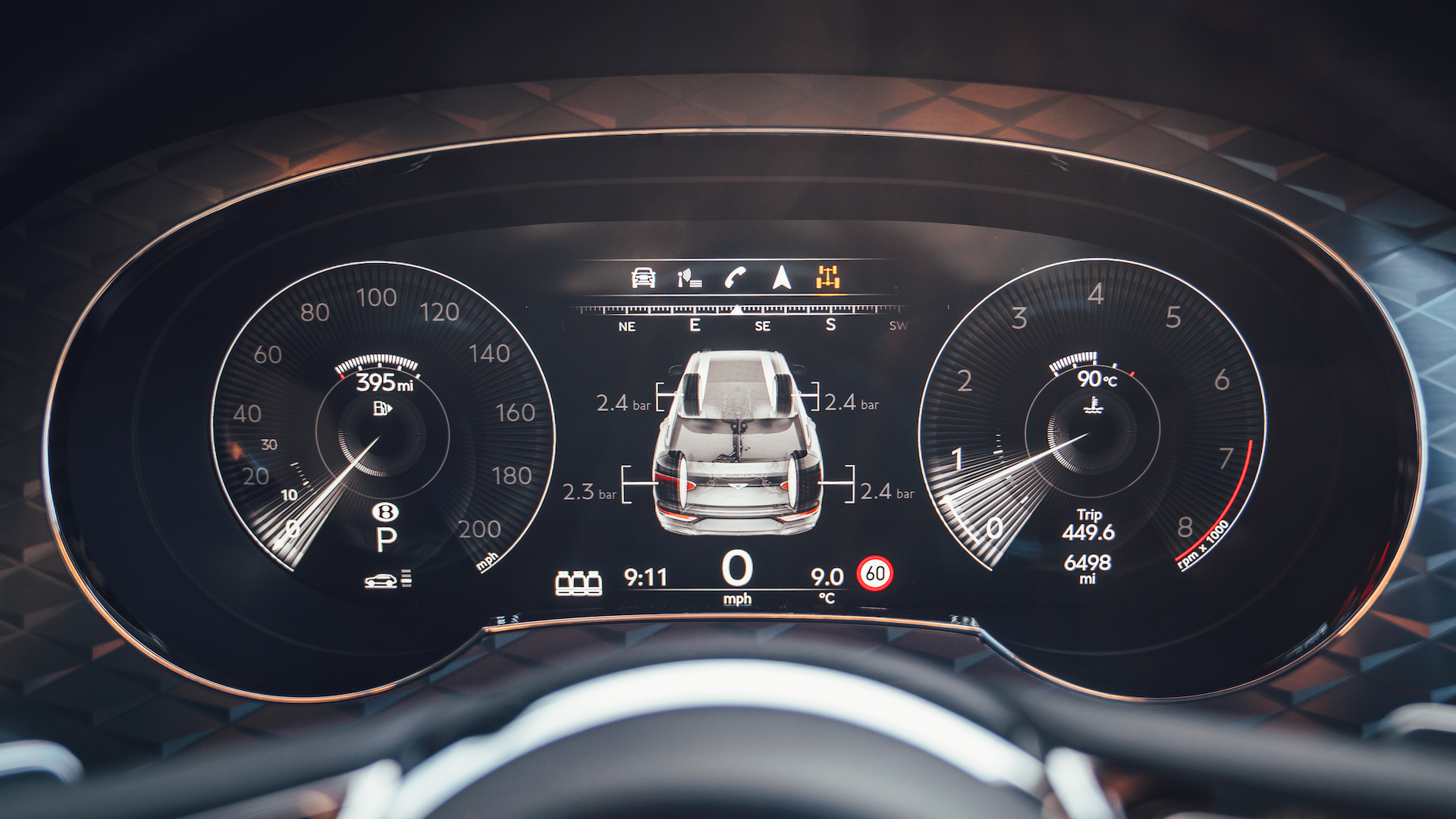 The digital dials we’re a little so-so about. They look nicely tech-y, and you can do useful stuff like alter the information you’re seeing, and bring up the full navigation map, but there’s something about the handsome old analogue dials that just seemed a little more Bentley-ish to us. The buttons on the steering wheel — actual, physical buttons again — make it all easy to use, though. There’s wireless charging for your phone, and two USB-C sockets under the armrest.