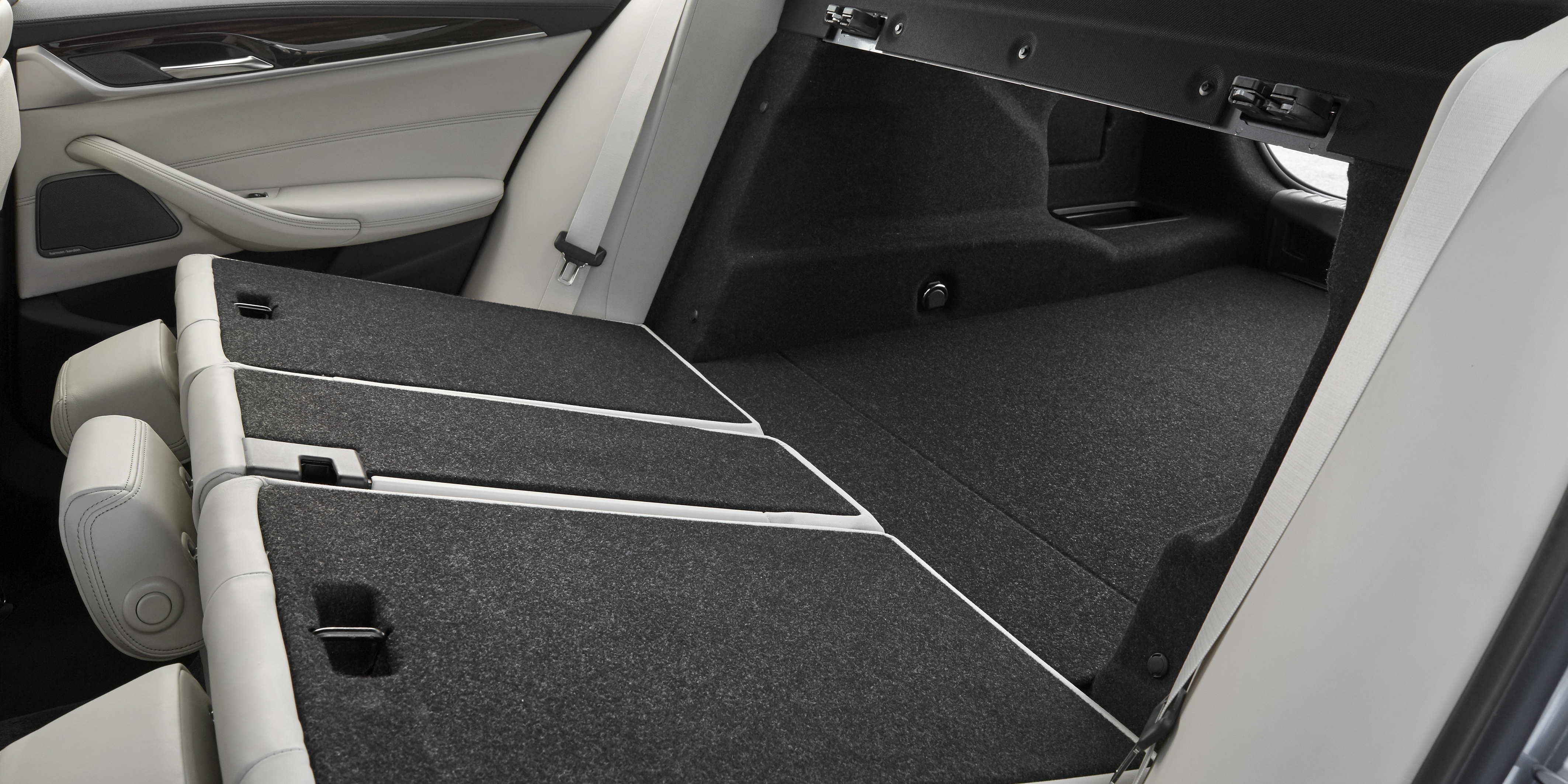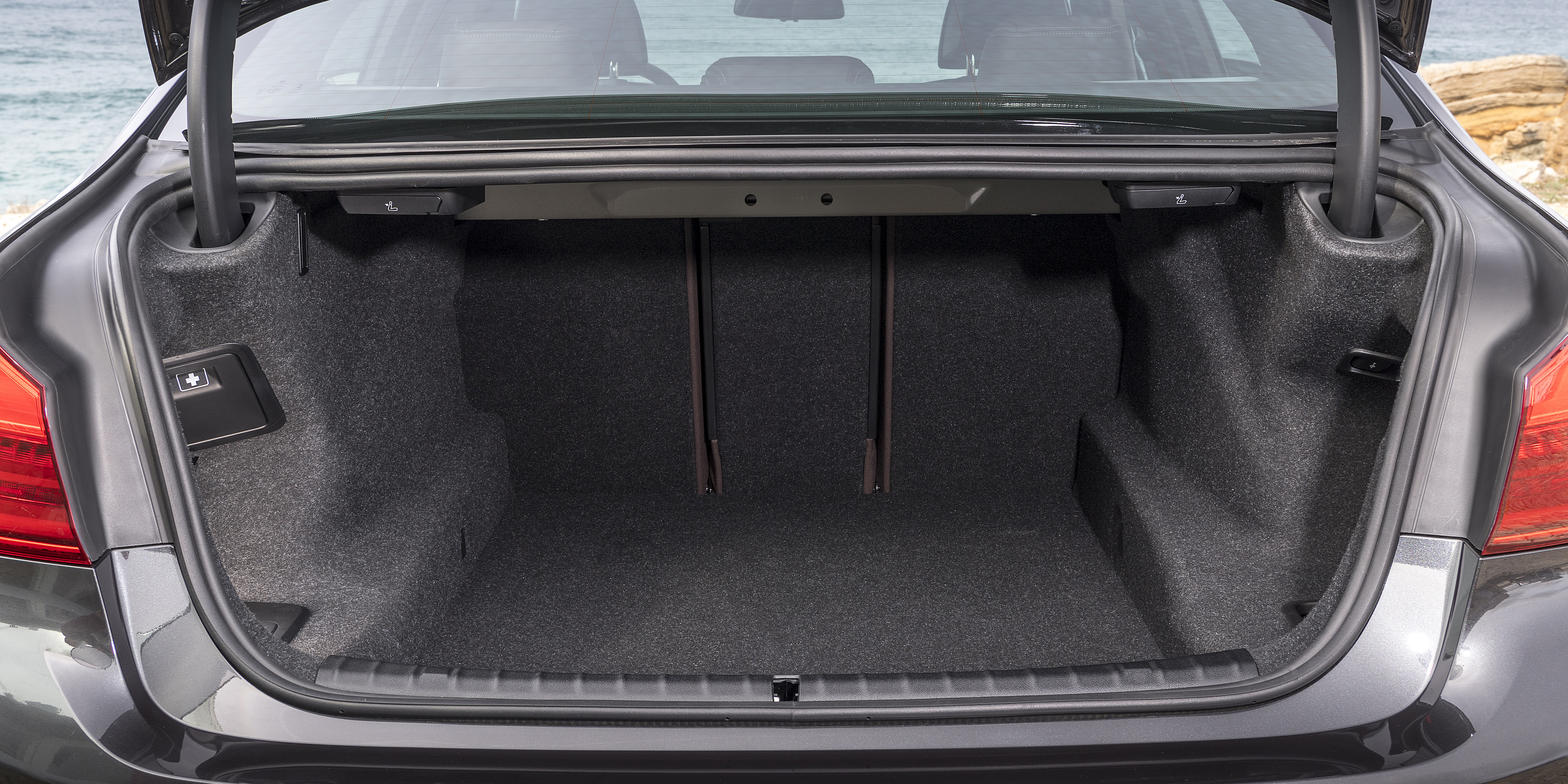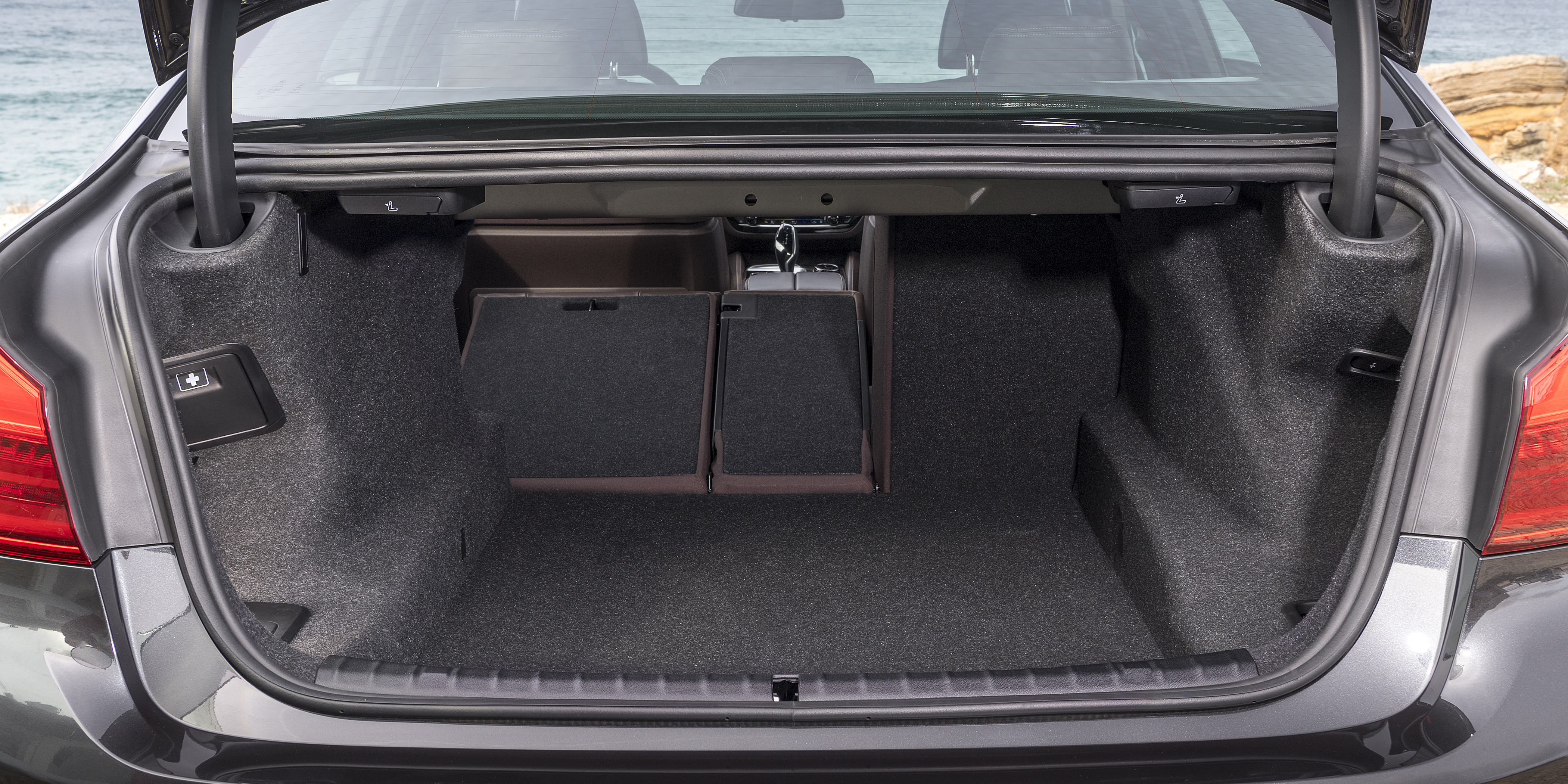 The BMW 5 Series can carry 530 litres of luggage with the rear seats in place. That’s identical to the Audi A6 and only 10 litres less than the Mercedes E-Class. You’ll be able to fit a baby stroller, or two large suitcases and two small cases without folding the rear seats – and the small boot lip and wide opening make it easier to lift in large luggage than in the Audi or Mercedes.