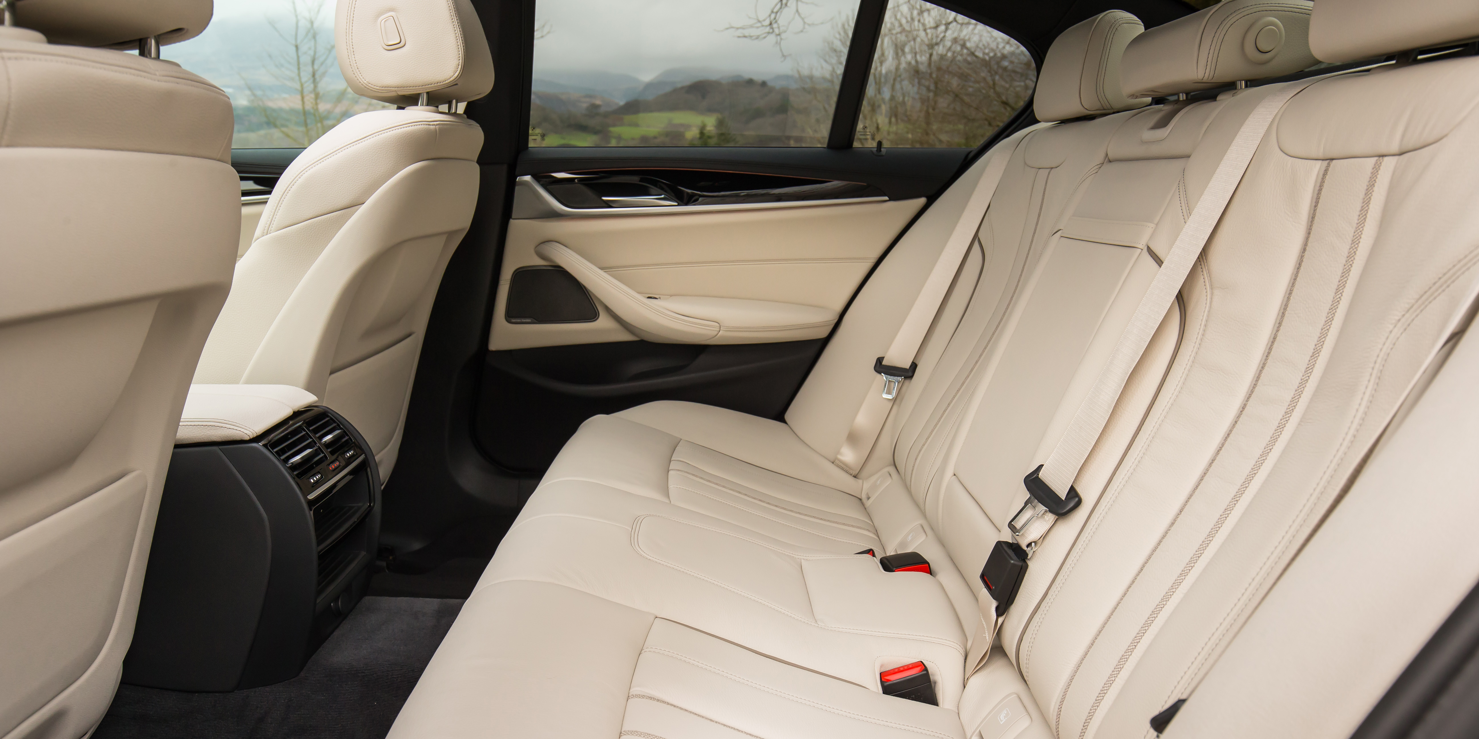 The rear doors open nice and wide so it’s a breeze to jump in the back. There’s absolutely loads of legroom and even your tallest friends won’t be left wanting for headroom. There’s more shoulder room for carrying three abreast than you’ll find in a Mercedes E-Class but the 5 Series’ rather hard central seat and large hump in the floor means your third passenger won’t be particularly comfortable on long trips.
