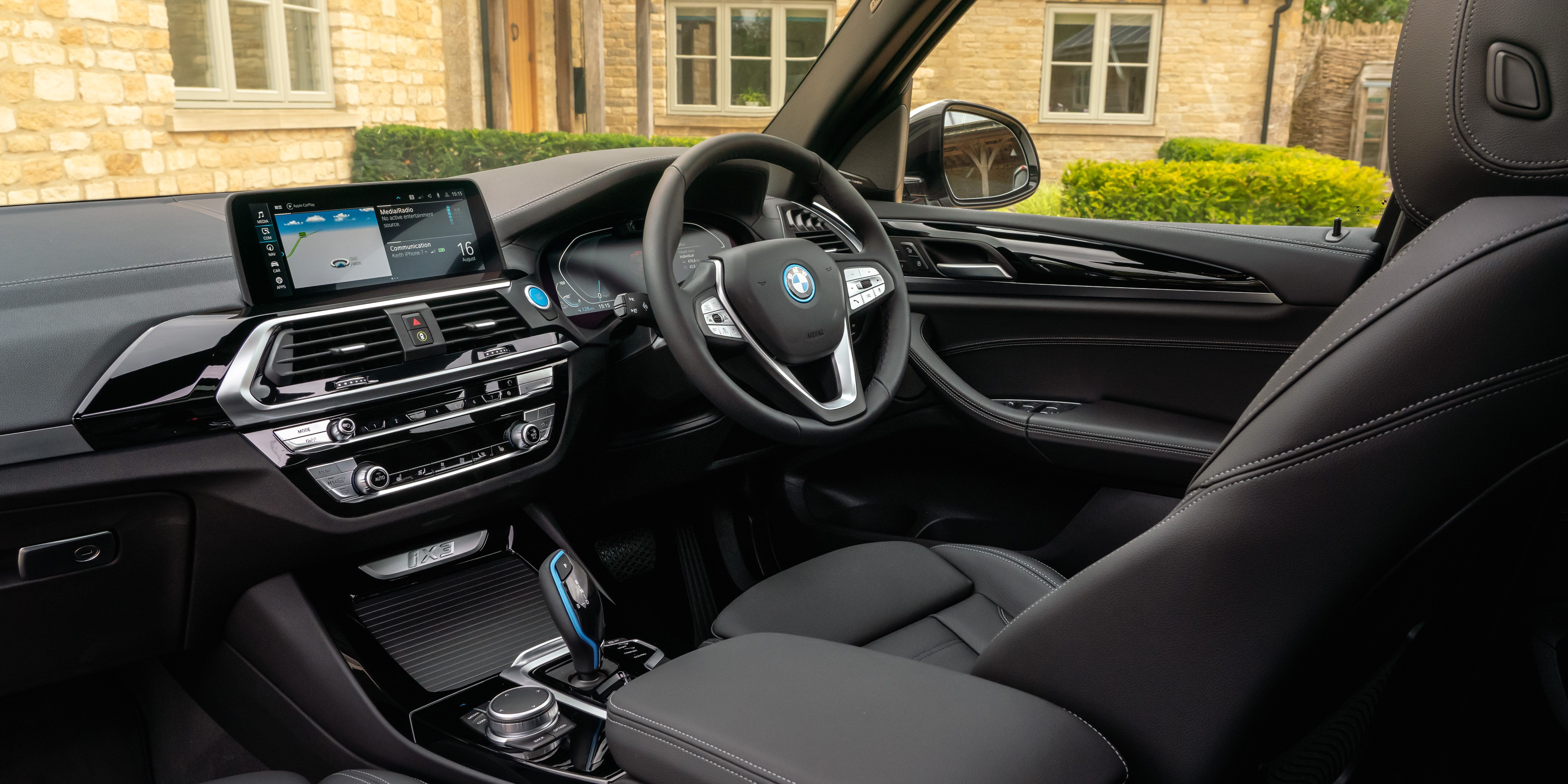 Flashes of blue on the exterior trim further mark the iX3 out against the petrol or diesel versions, and that extends to the interior too. The dashboard and cabin are much the same as any other X3, but with a posher digital display, and blue trims on the starter button, steering wheel and gear lever.