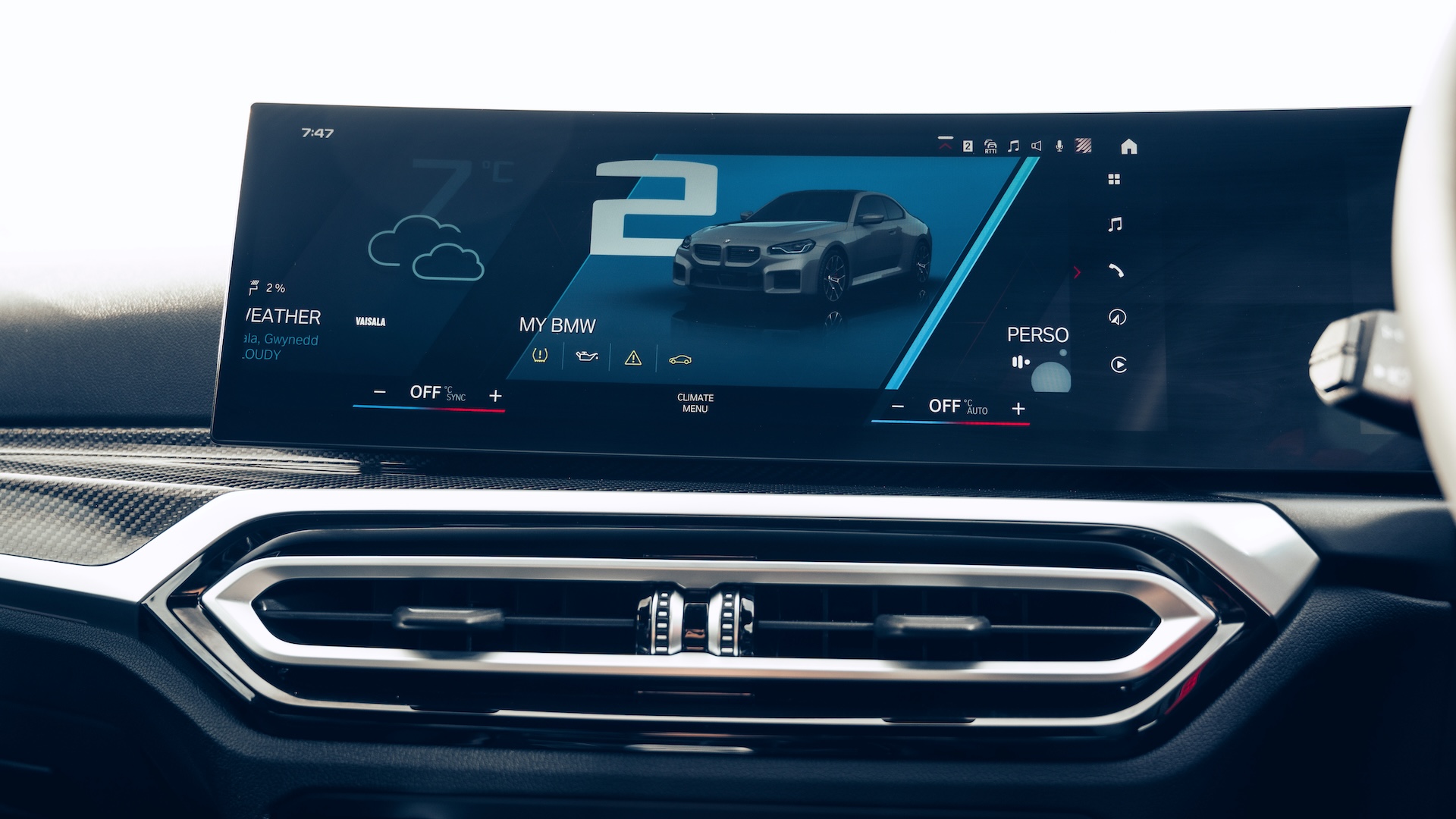 One thing that does jump out at you, though, is the ultra-wide, twin-screen set-up on the dashboard. It’s made up of a 12.3-inch driver’s display and a 14.9-inch infotainment system running the latest BMW tech.