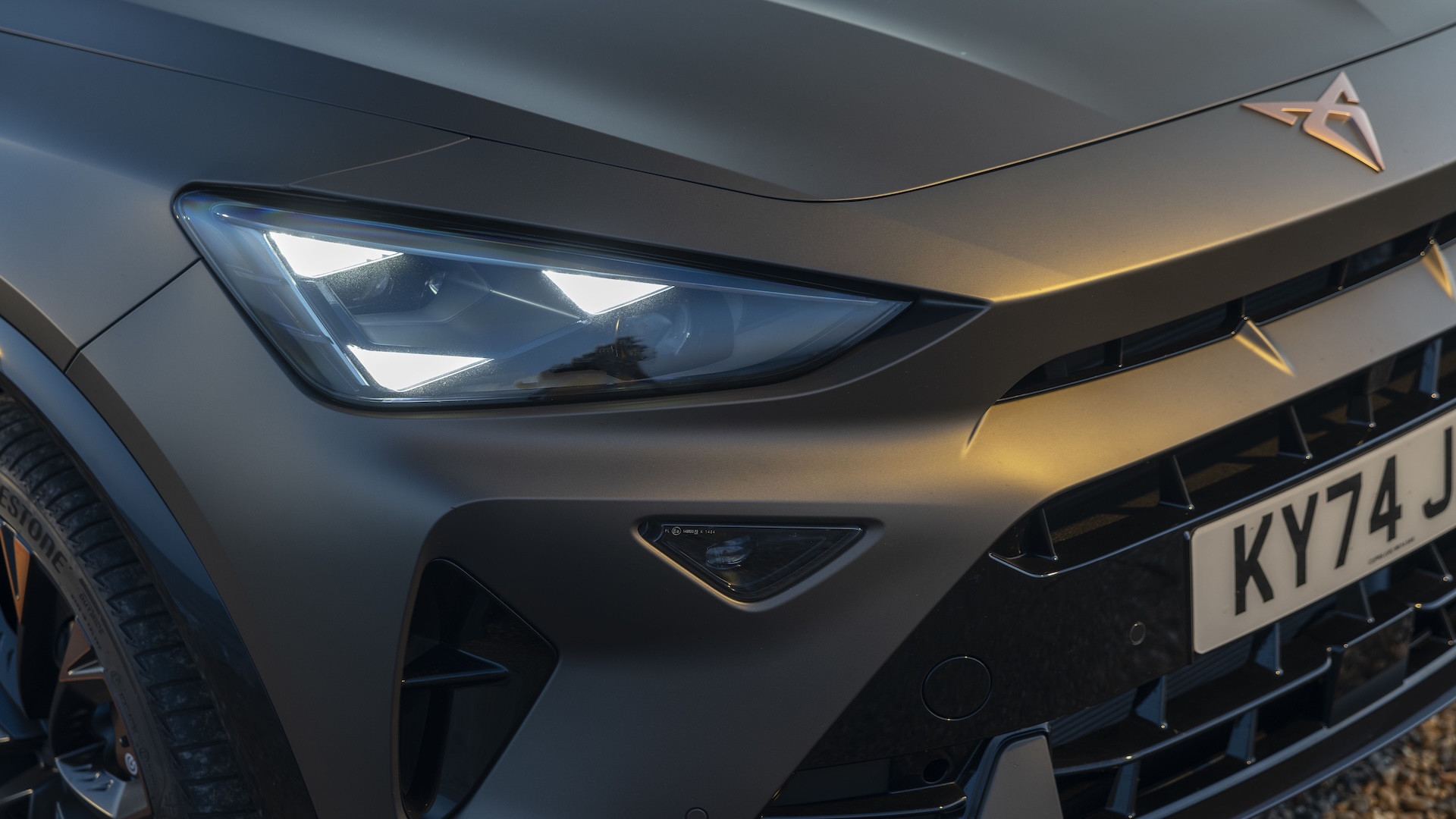 When it first launched, the Cupra Formentor shared a grille and its front-end styling with SEAT cars. But the facelifted car, which we’re reviewing here, has a new look that brings it in line with the rest of the Cupra range. Like the Leon and Terramar, it features cool triple-triangle LED daytime running lights and a thrusting bonnet with no upper grille.