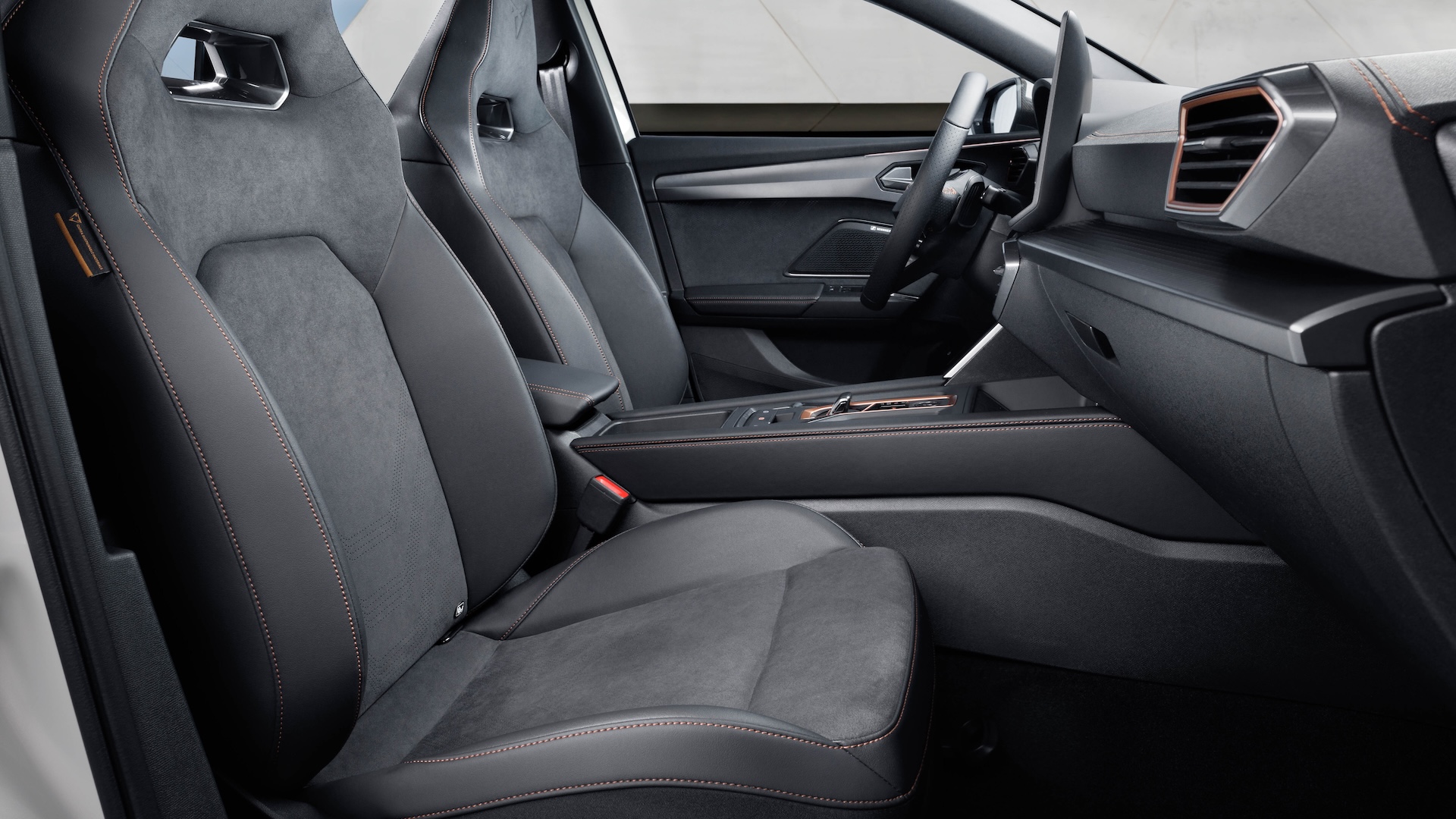 Copper highlights lift the otherwise dark cabin and you also get one-piece seats with lots of side support, ‘Cupra’-scrawled kick plates, ‘Cupra’-emblazoned carpets and aluminium kick plates.