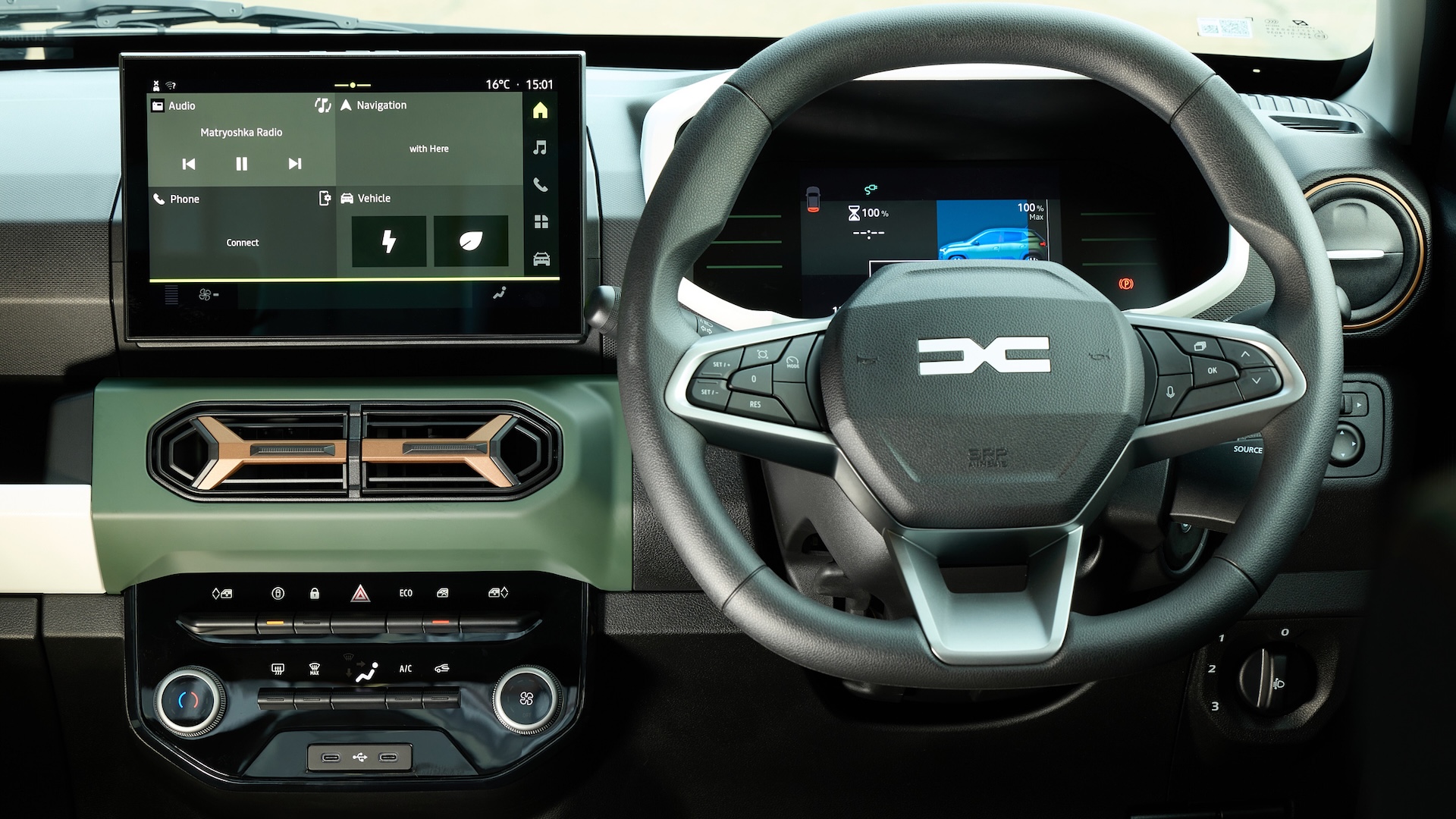 The Dacia Spring’s interior is to be commended for how similar it feels to the rest of the Dacia car range. You get the same digital gauge cluster and the same touchscreen on top models, plus most of the same switchgear. This ensures you don’t feel too punished for choosing one of the cheapest cars on sale.