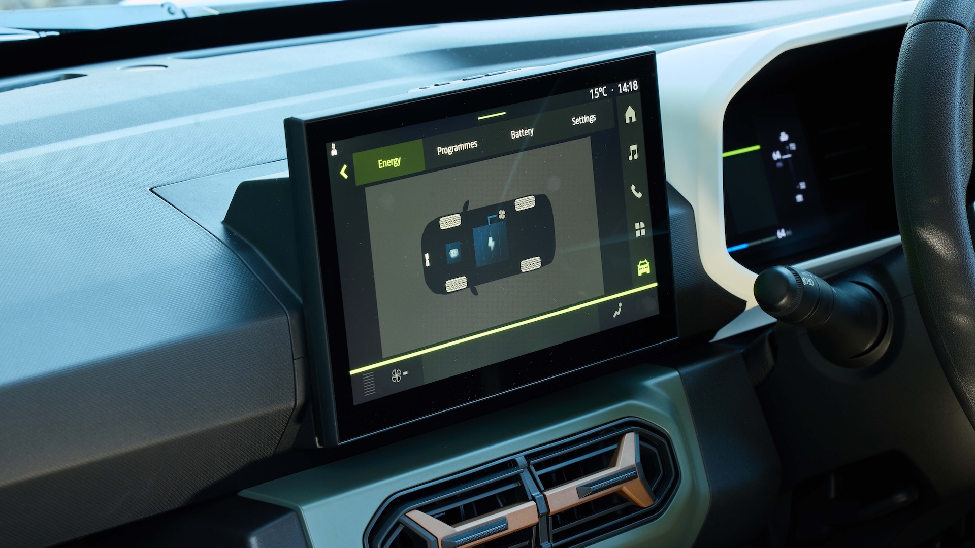 And in fact, while Dacia could easily have punished buyers with a sea of black plastic and ugly trim, even the base model of the Spring gets a nice pop of colour across the air vents to lift the interior ambiance. This is bright orange on the entry-level Expression model, while the Extreme version gets khaki-green coloured trim on the dash and the seats, plus some white plastic to contrast.