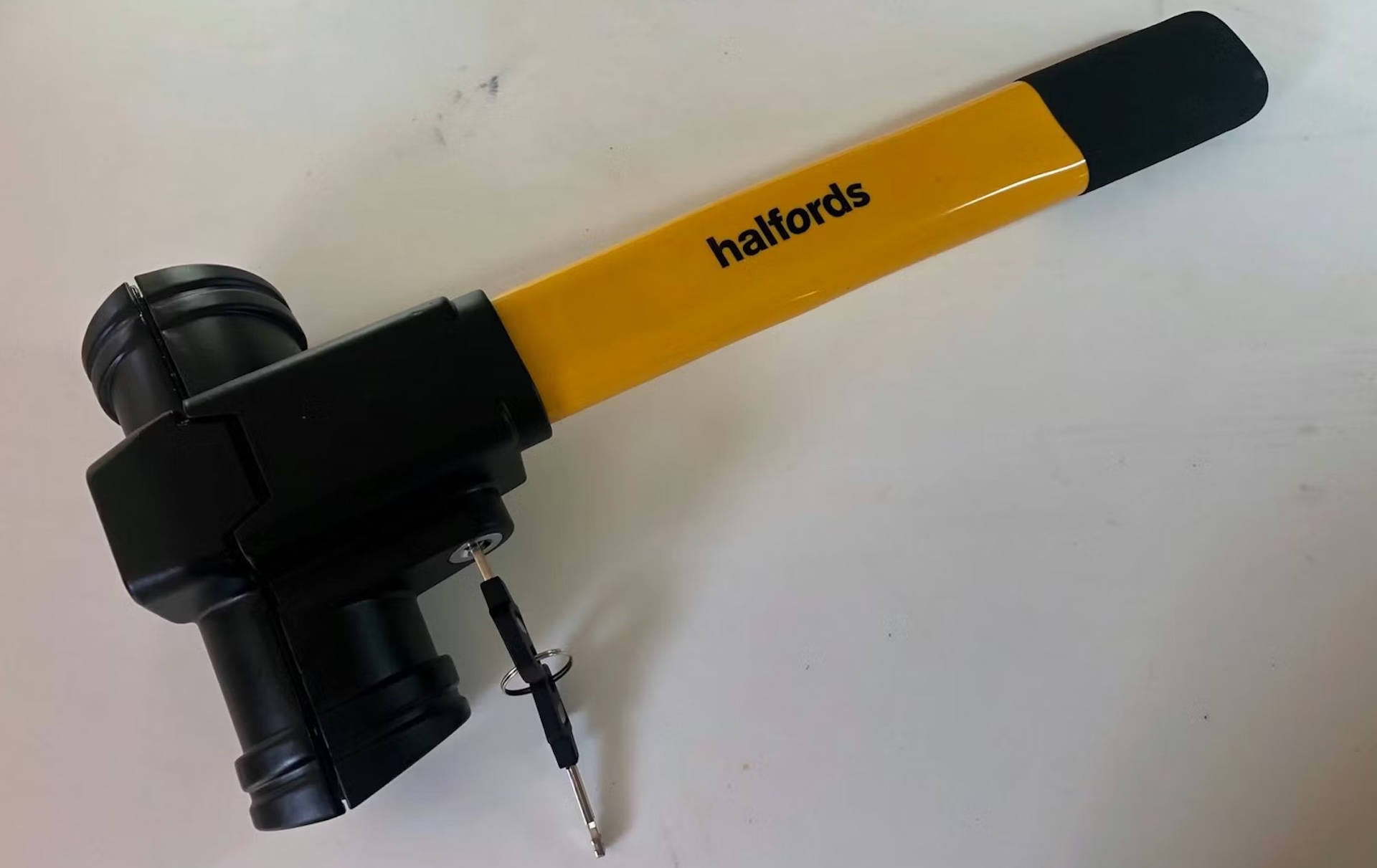 For a compact, easy-to-use option, the Halfords T-Bar is a smart pick. It clips over the steering wheel, its bright yellow bar visible to deter thieves, and fits most cars without taking up much space. Foam lining protects your wheel, and it’s simple to install. Note that it doesn’t protect airbags and could be bypassed by determined thieves.