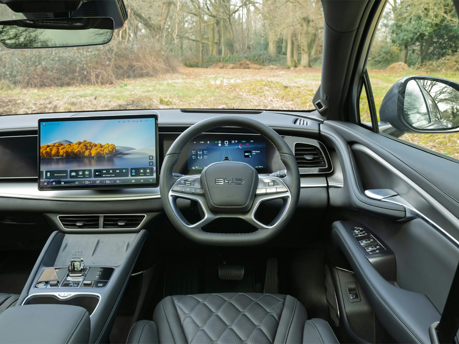 Step inside the BYD and the first thing you’ll notice is that quality is really good. There’s loads of leather around the place, and it feels really premium as well. I also love the comfy seats, and the design is interesting with all the swoopy surfaces.