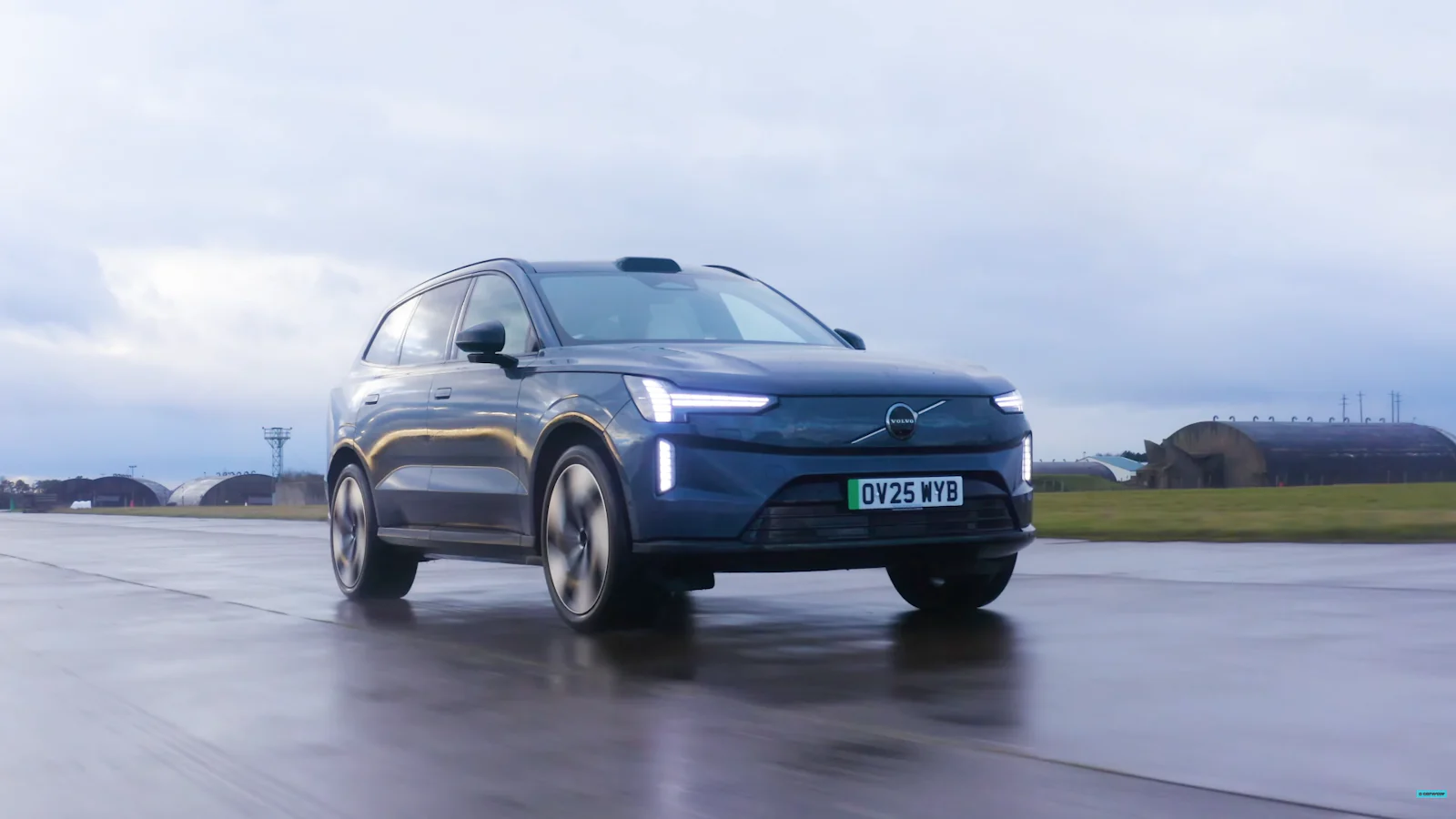 The EX90 is closely related to the Polestar under the skin, but it’s a bigger, more practical car – you get a boxier body and three rows of seats. That means that with the same 107kWh battery as the Polestar, it gets 375 miles of range (officially) – because our test car is the Twin Motor model with 408hp.