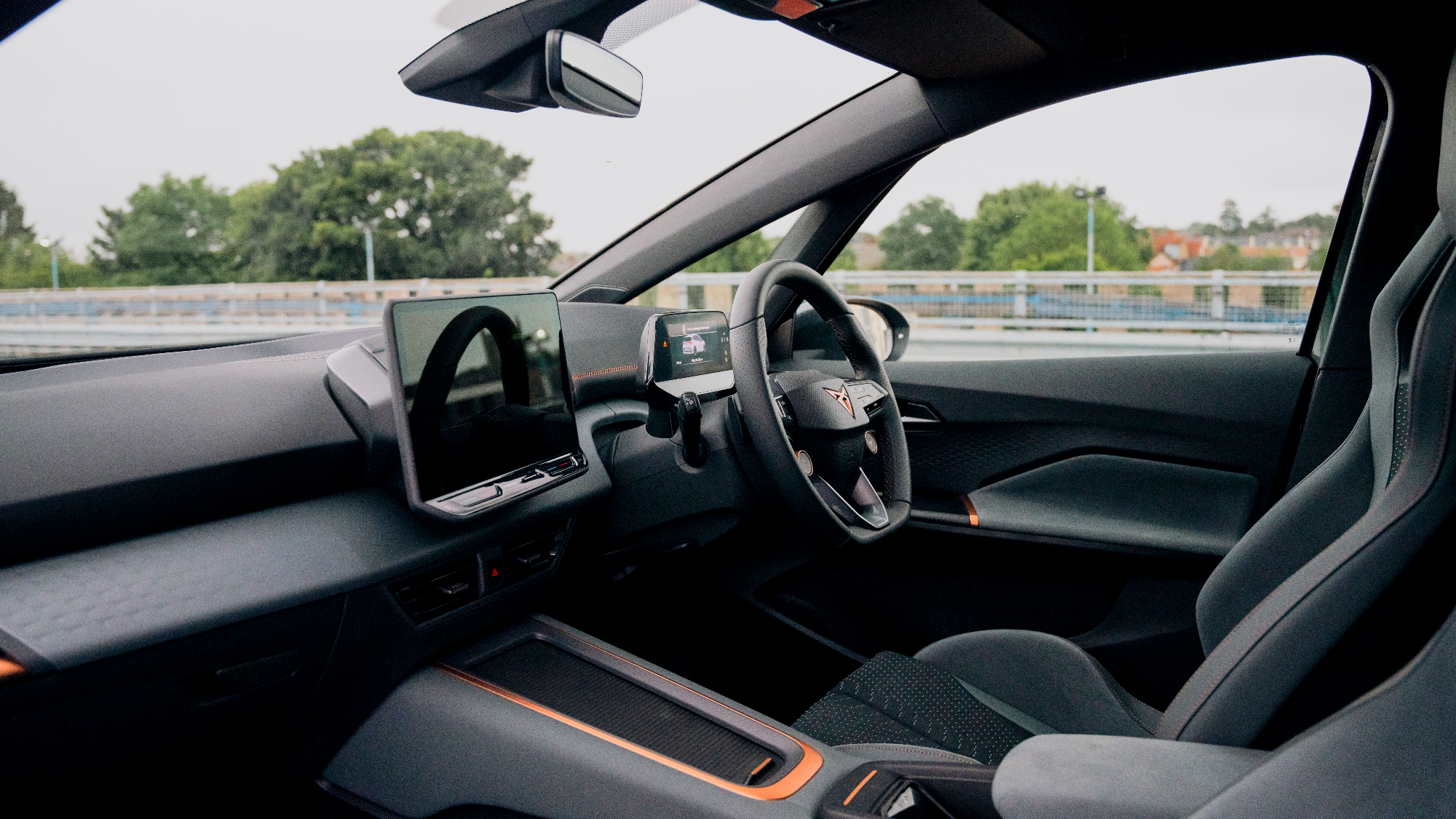 Inside is where the Cupra starts to claw back some points, because it’s got a lovely cabin. The materials all feel really plush, and I especially like the Alcantara details on the seats and door cards. It makes the car feel sporty and special, and the copper details are a nice touch.