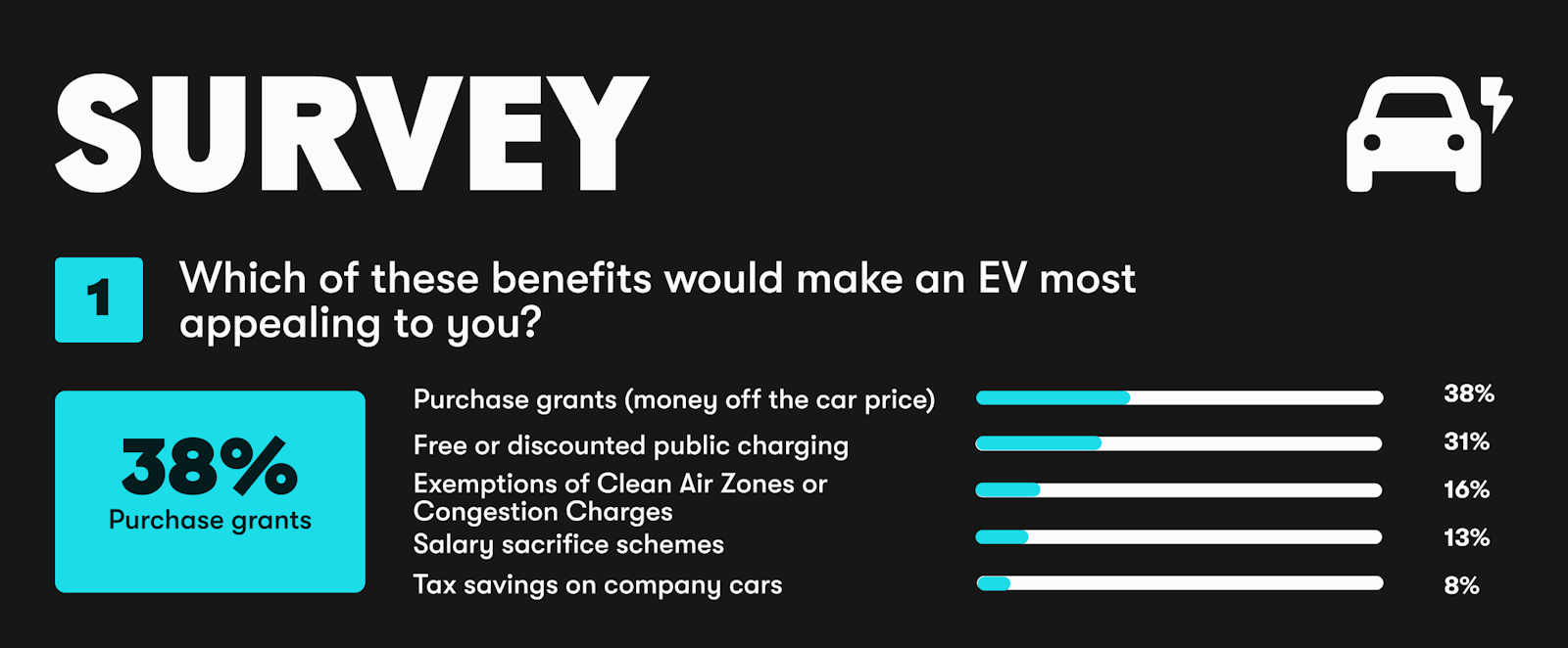 However, recent data from the survey indicates that the grant has provided a big incentive for many people in the UK to invest in EVs. 73% of drivers admit a full £3,750 electric car grant would make them more likely to switch.