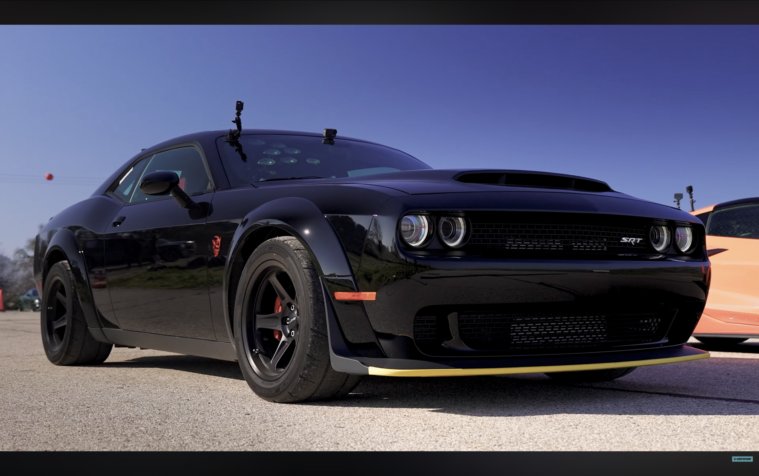 We’ve had Ford, we’ve had General Motors – now here’s the third part of the Detroit Holy Trinity. The Dodge Challenger was first introduced in 1969, but the generation we’re testing here was produced from 2008 – 2023. We’re testing the most extreme of the bunch – the SRT Demon, which was specifically designed for the drag strip – so it’s in with a good chance here.