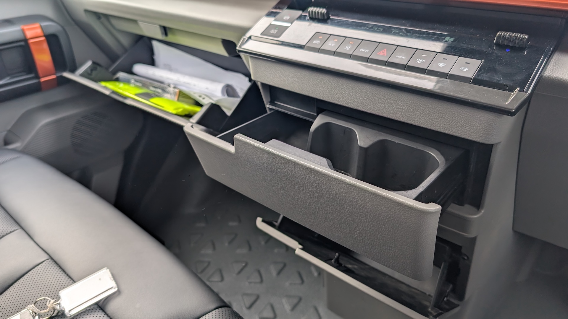 The cab of the SV looks neat, with a horizontal and minimalist design. An orange-coloured bar breaks up the sea of different-coloured grey plastics, but that’s about it for design flair. The materials feel a bit flimsy in places, too, especially covering the storage areas.