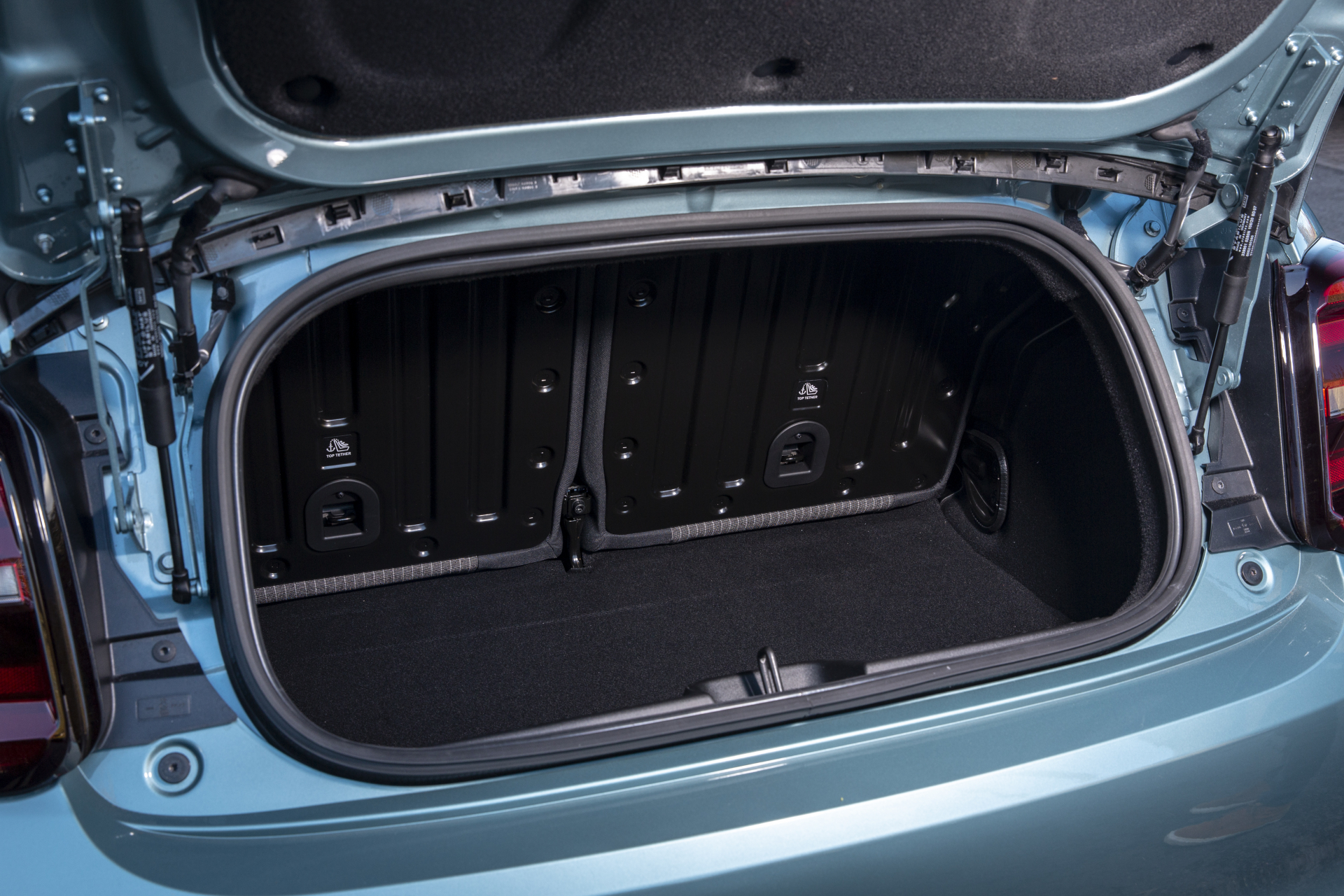 What you do get are two quite accommodating front seats that support even larger drivers well. There’s a reasonable level of adjustment, and the steering wheel moves for reach as well as rake. But the seat base is set quite high due to the batteries underneath it, so taller drivers may find their head brushing the roof - and that their hair is particularly susceptible to being buffeted about when the roof is down.