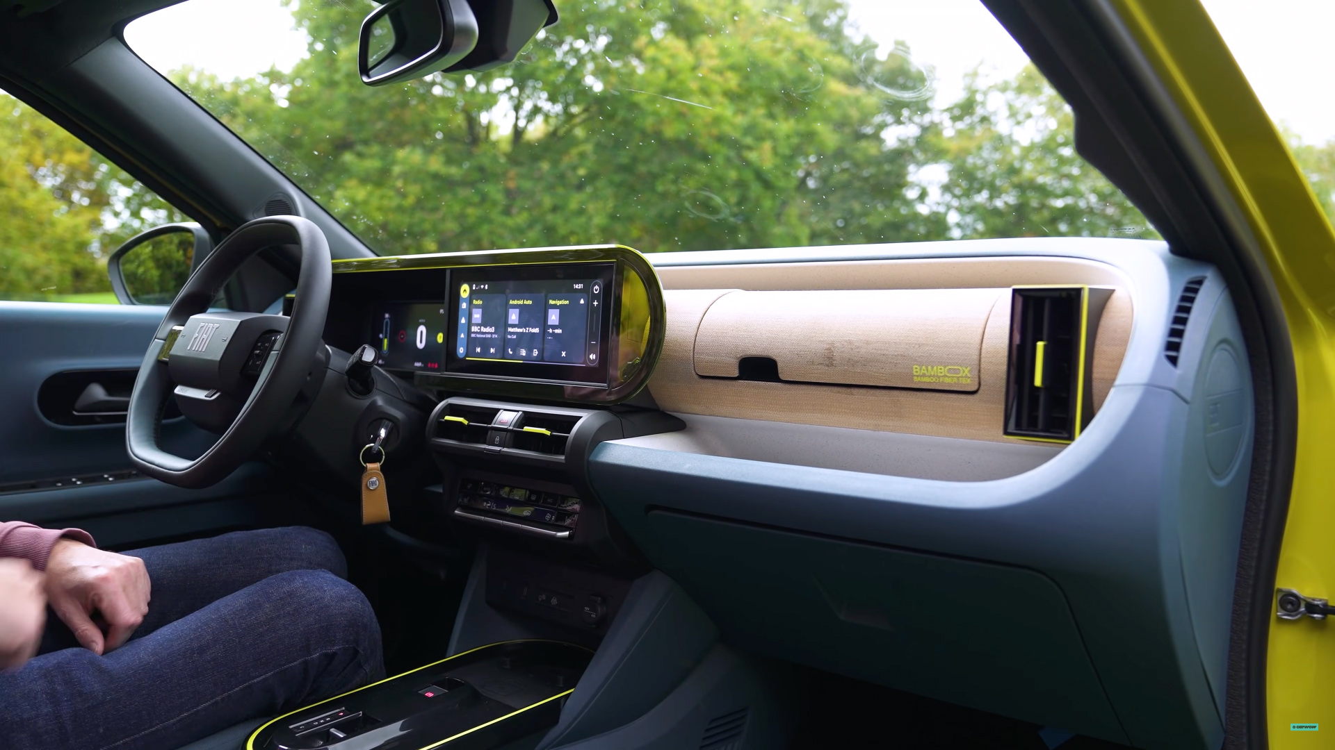 The plastics are all a bit cheap-feeling, but I can forgive it because they’re all so brightly coloured. I like the blue you get on the doors and the dashboard, and this range-topping model has a bamboo storage box in front of the passenger. It’s such a cheery cabin.
