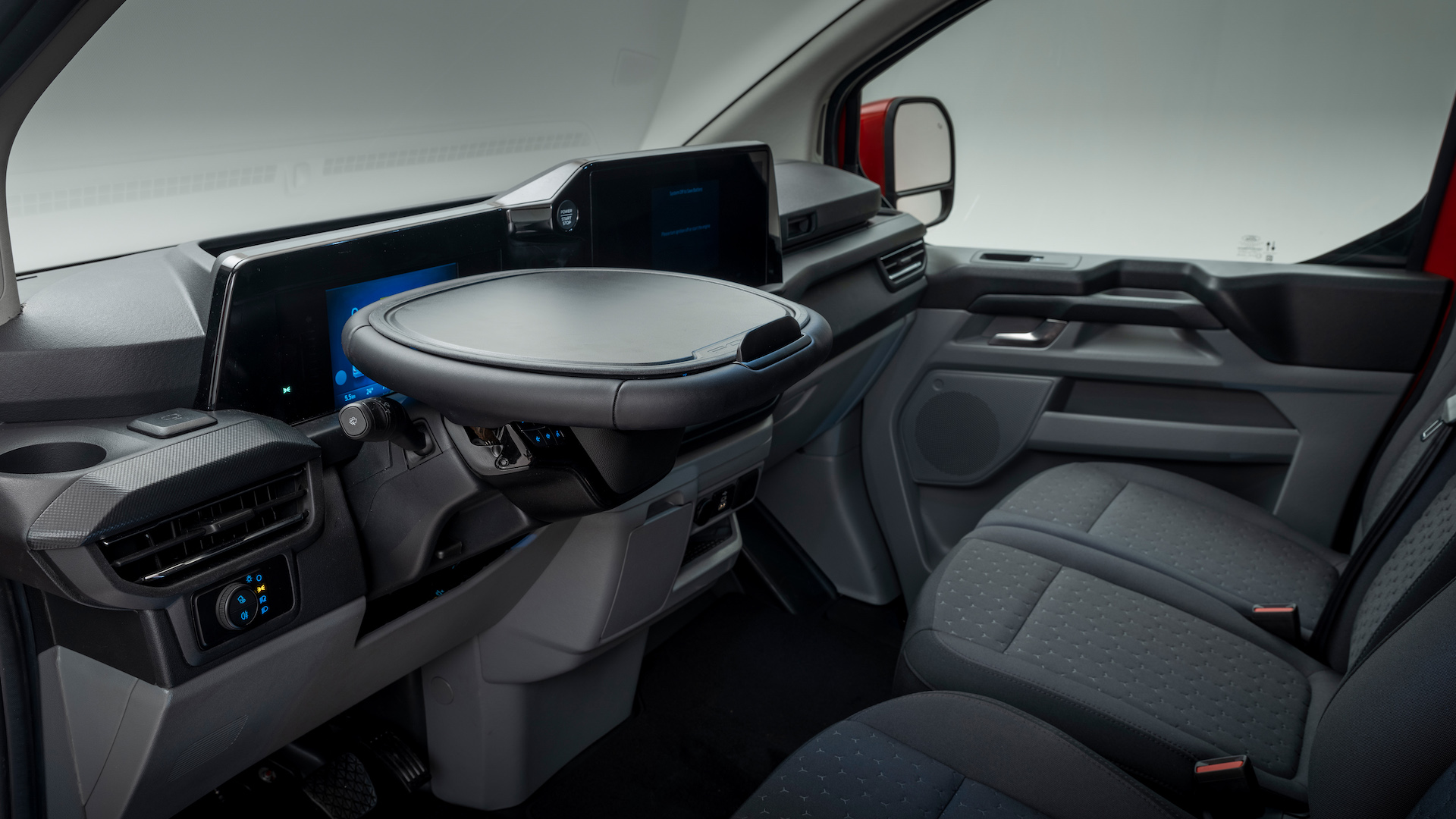 Visibility is excellent in the new E-Transit Custom. The large door mirrors have a lower fisheye section, ideal for minimising blindspots and checking on your rear wheels as you go around tight corners. Optionally available on all models is a ‘smart’ rear-view mirror that shows a camera feed from the rear - the first van to offer such a thing, and a useful addition. It also includes front and rear dashcams.