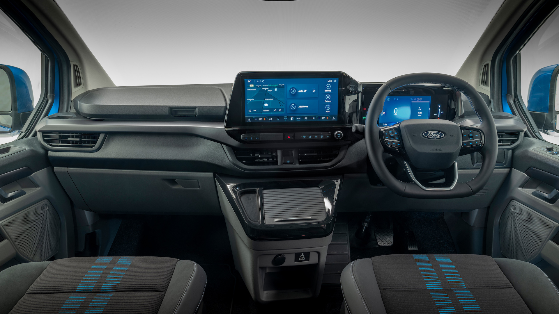 The E-Transit’s gone the way of many passenger cars and eschews physical controls in favour of touchscreens. The main infotainment screen is a massive 13.0-inch affair, with permanent air-con controls in a bar along the bottom. It’s bright, clear and easy to operate, but some people might prefer having buttons instead. The E-Transit does have built-in Alexa functionality if you’d prefer to use voice commands.