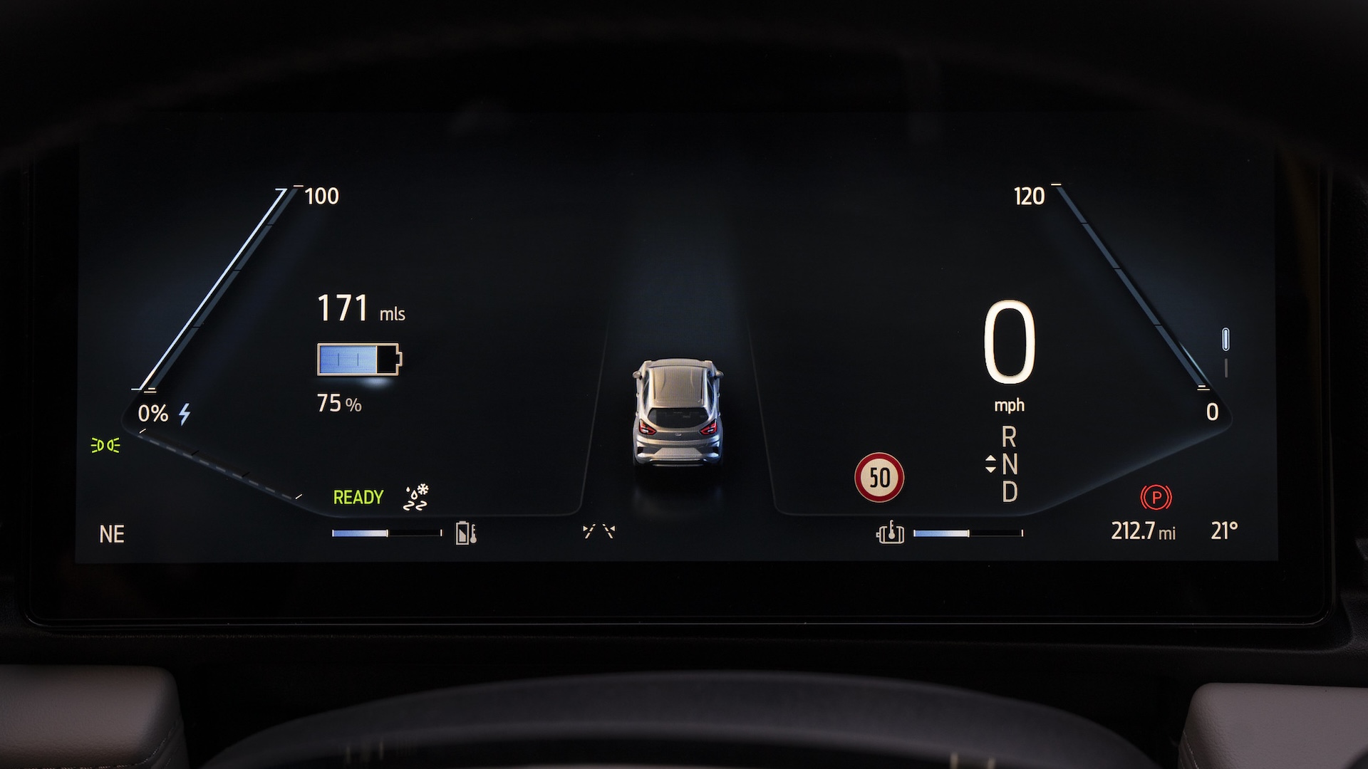 The digital gauge cluster is pretty uninspired in its design, and you can’t select from alternative layouts like you can with some alternatives. One annoyance is that the speed readout is always off to one side, rather than front and centre.