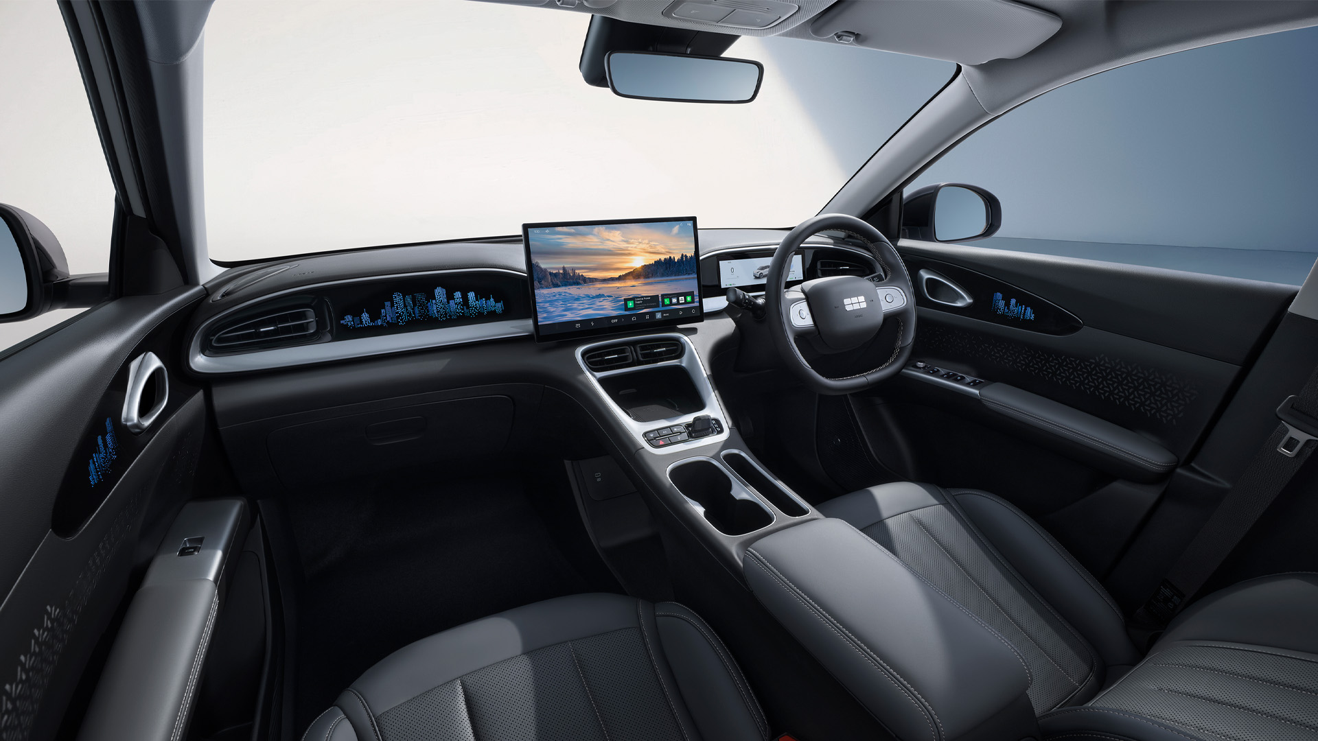 The dashboard has some nice touches – there are city skyline graphics on the doors and dash, backlit by the ambient lighting, and the whole centre console and door card is upholstered in artificial leather making it feel nicely plush.