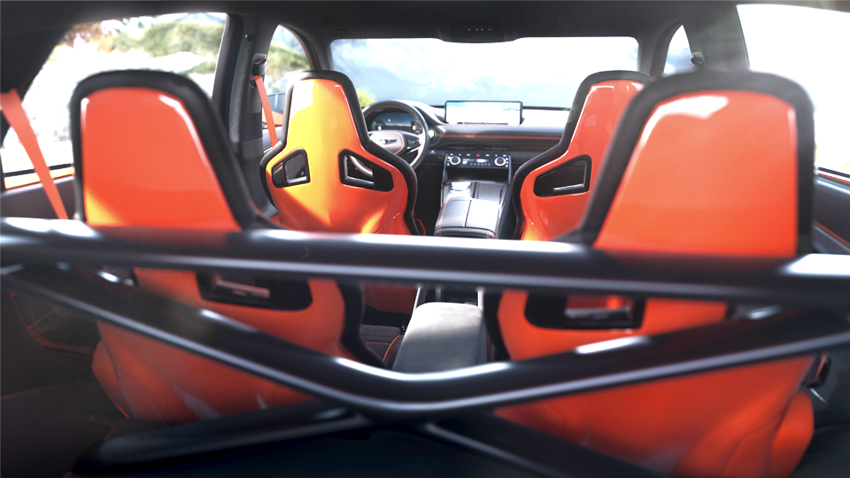 Genesis has done more than just make the GV80 Coupe look sporty, it’s also made a few changes to the chassis to make it more fun to drive. There’s that carbon fibre roof which not only keeps the weight down, it also lowers the centre of gravity. You’ll also notice the massive X-shaped strut brace in the back to stiffen things up.