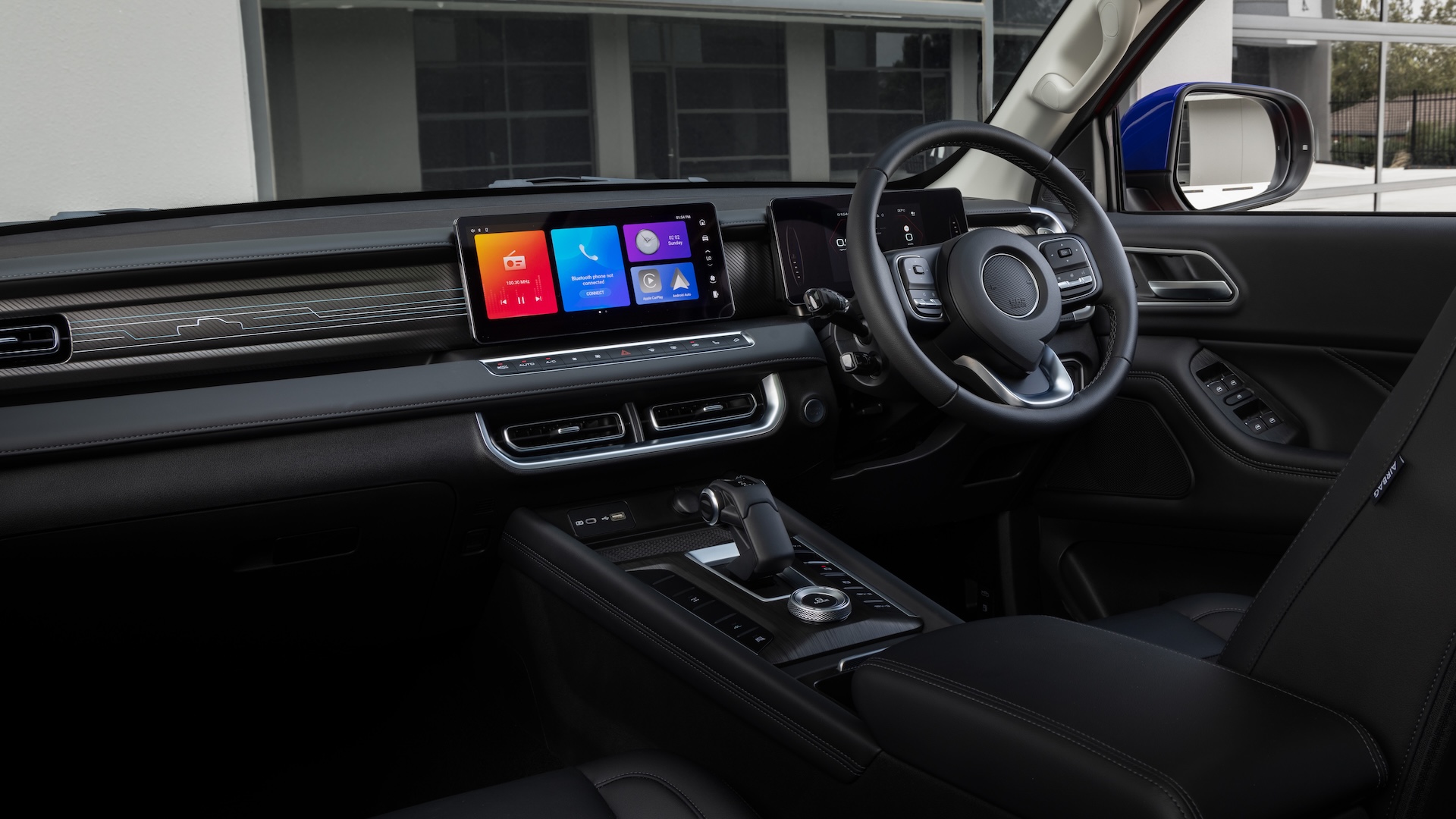 The GWM Poer300’s interior is impressively car-like in both design and construction. Though it does use plenty of cheap, hardwearing materials lower down, there’s a nice swathe of artificial leather trim as well as a genuinely stylish backlit portion with the outline of the truck. The grille logo being mirrored in the steering wheel boss is also a neat touch.