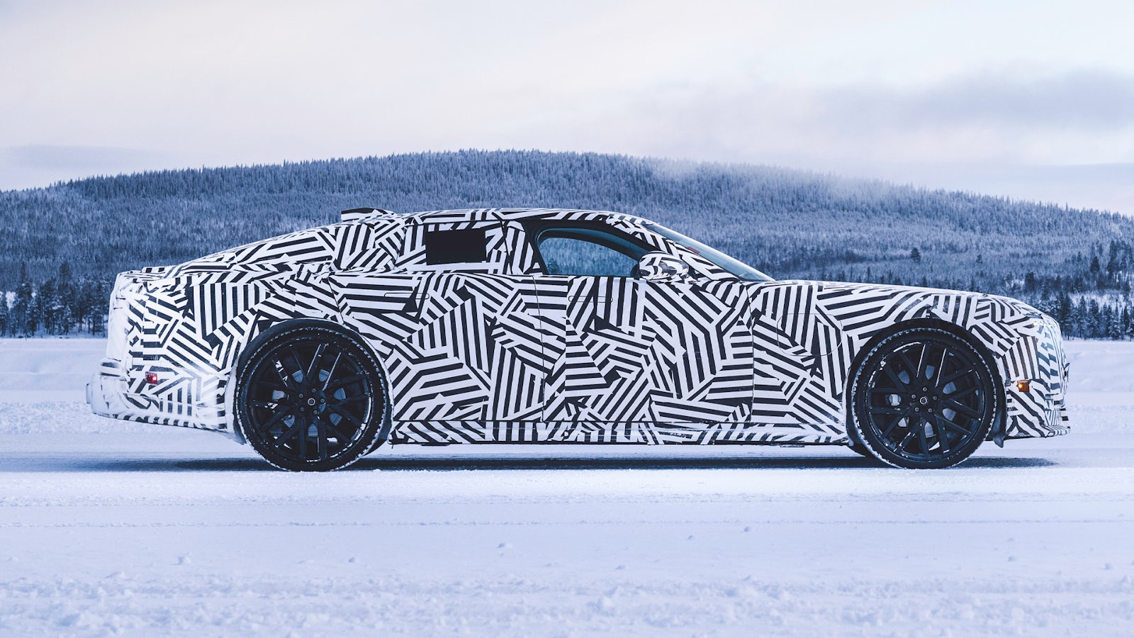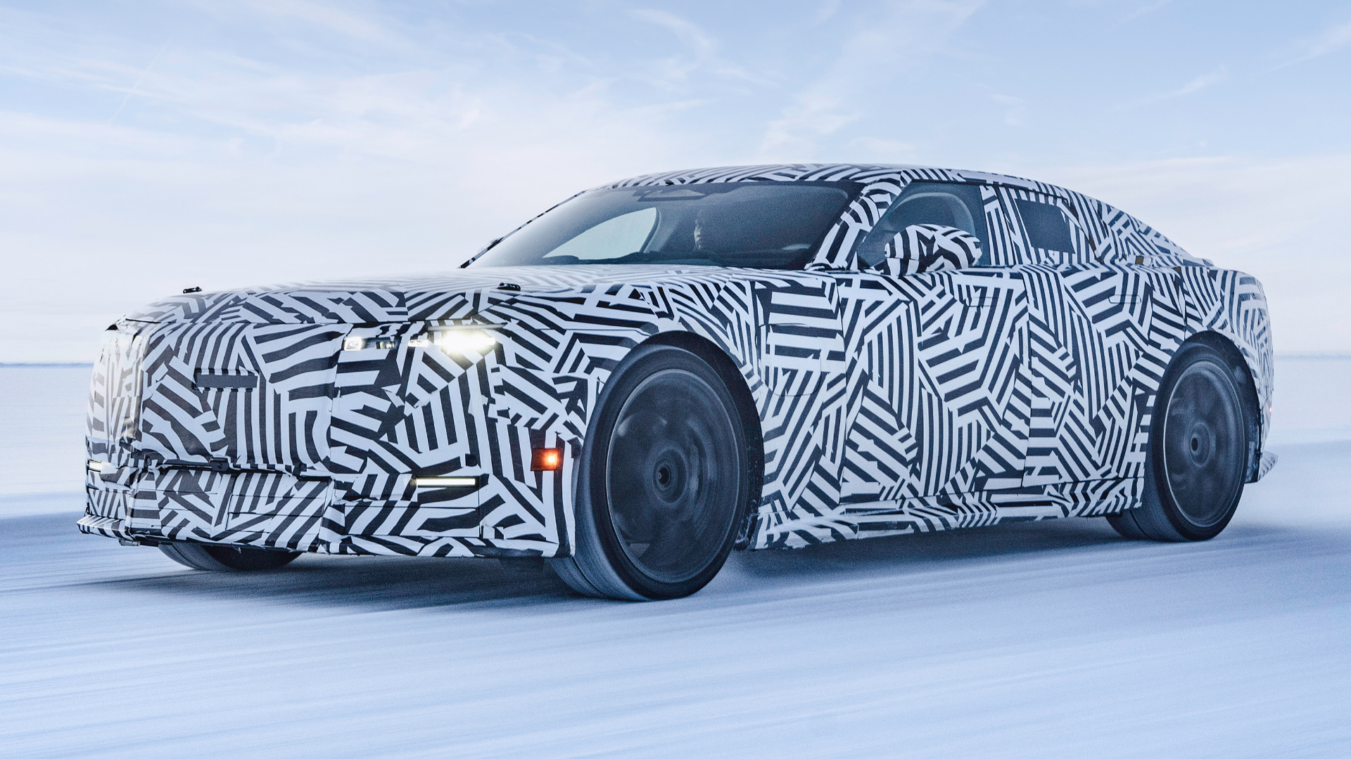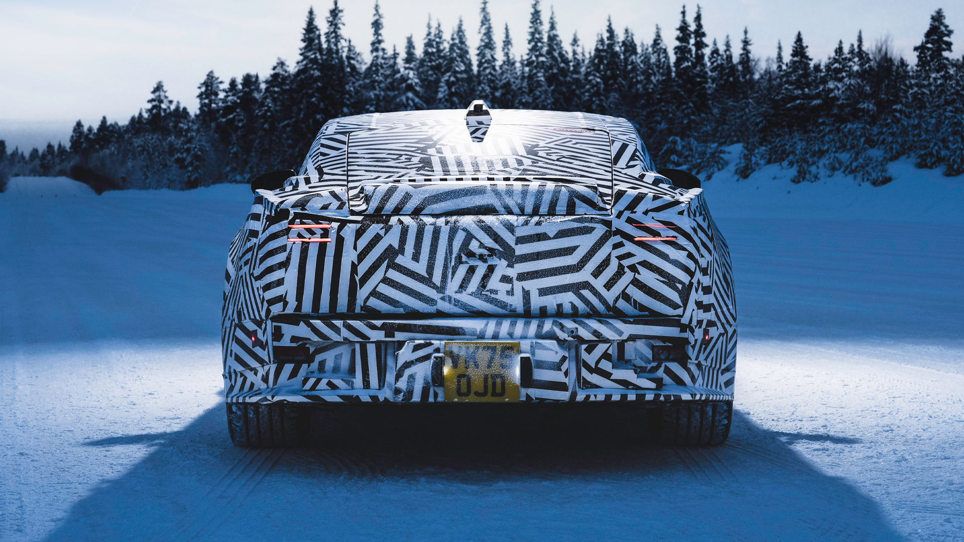 Looking at this camouflaged prototype, the front end appears to be very similar. It has an insanely long bonnet for a car with no engine under there, and the blunt nose makes it look like a cartoon villain’s car of choice. You can also see the slim, rectangular headlights poking out of the wrap.