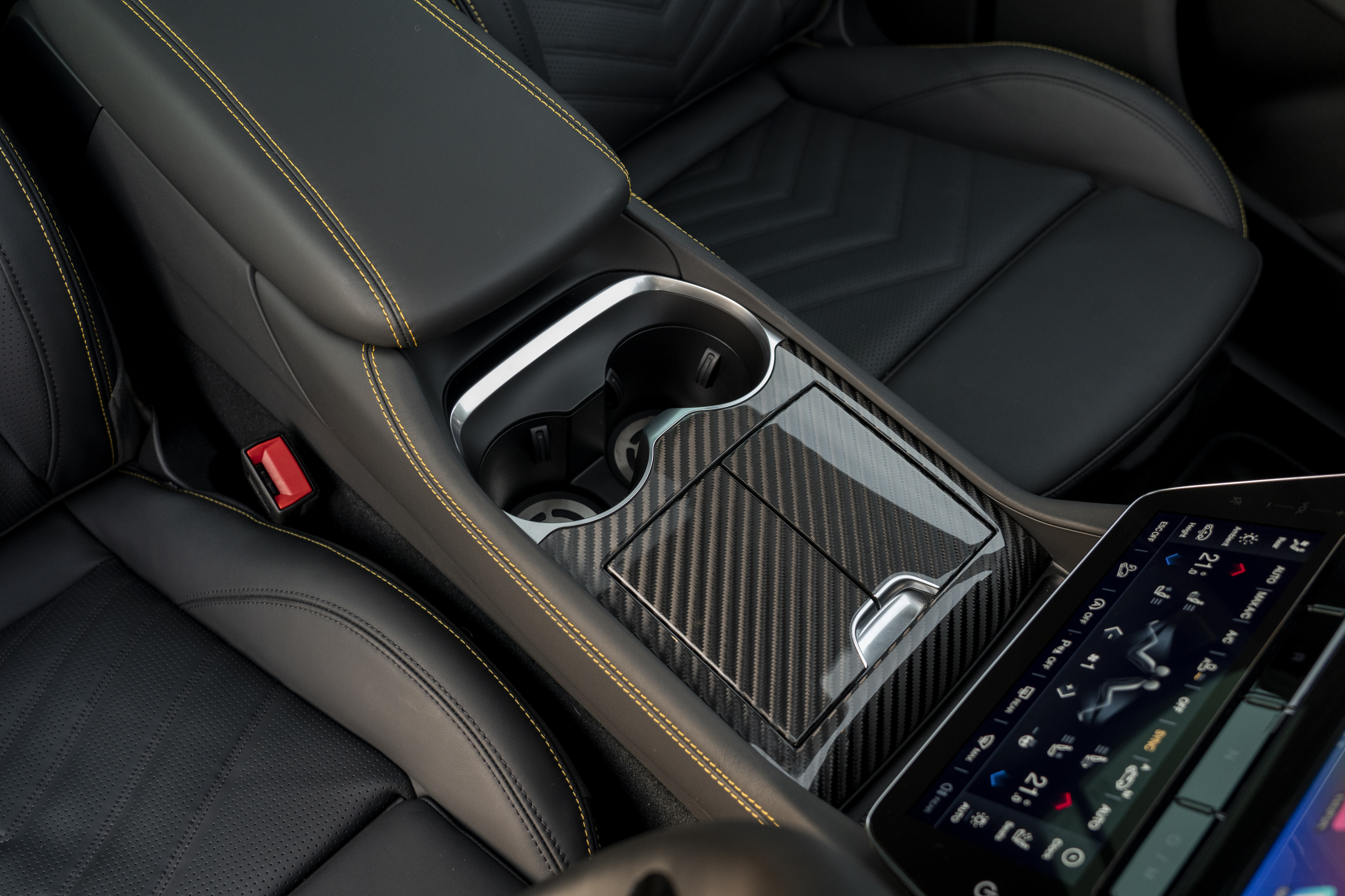 Starting with the commendable in the front of the very pleasant Grecale cabin, there are a pair of decent-sized cupholders and reasonable under-armrest storage, which is countered by a small glovebox and below-average door bins, the latter hampered by the hefty speakers in the doors.