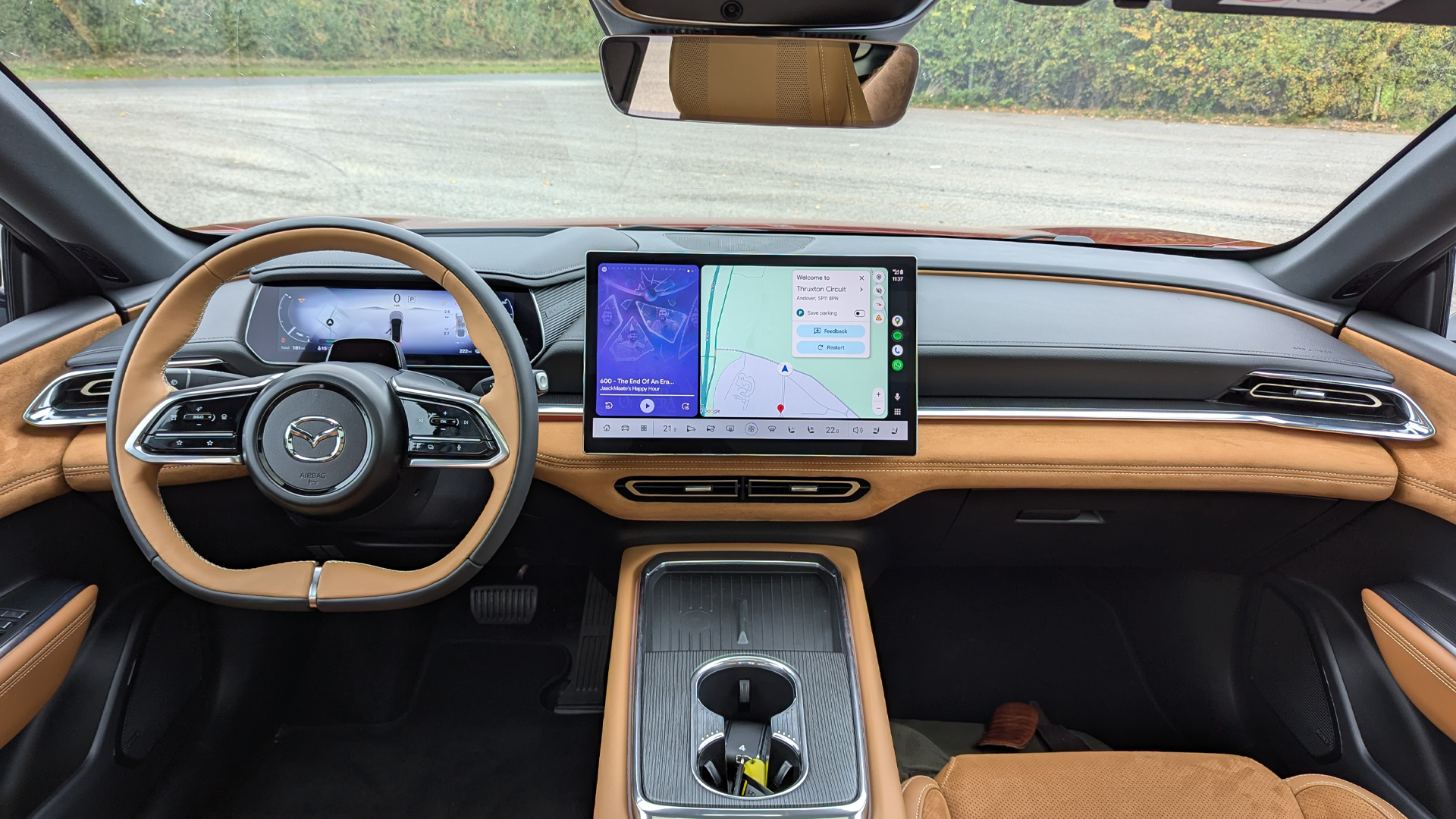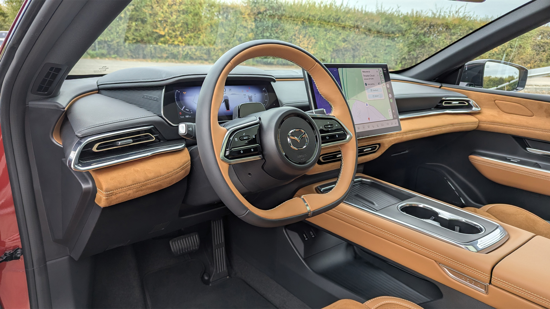 Moving into the back seats, it’s a tale of two halves. Legroom is decent – I had enough space behind my driving position, which is a rarity. However, headroom isn’t the best. People under six feet will be okay, but at 6”3’ I found that my head was just brushing the side of the roof. It’s still comfy, but a Tesla Model 3 is better for carrying rear passengers.I was impressed by the boot though. At 466 litres it may be 124 litres down on a Tesla Model 3, but it’s 60 litres bigger than a Mercedes CLA EV and the hatchback boot opening and low load lip make it really easy to load. It’s plenty big enough for the daily needs of a family, and you get a 72-litre front boot for your charging cables.Driving the new Mazda 6eI was pretty impressed by the Mazda 6e’s driving experience on a twisty road, but this came as no surprise because Mazda knows how to make a car fun to drive. It’s not quite as engaging as a BMW i4, but it’s not far off.