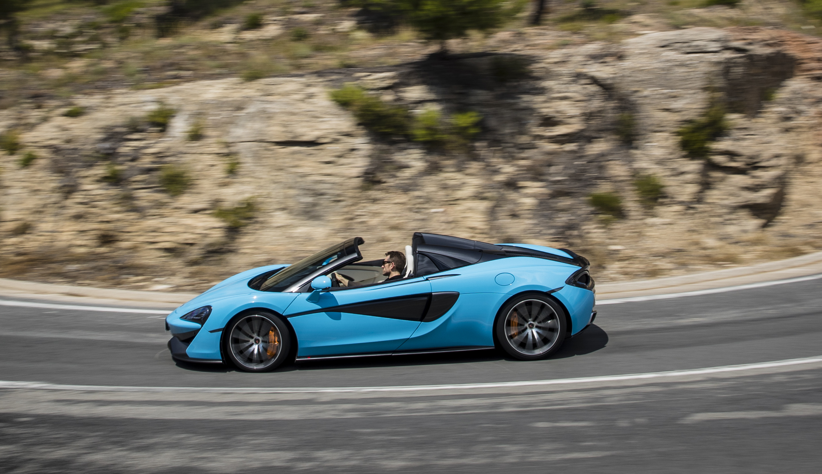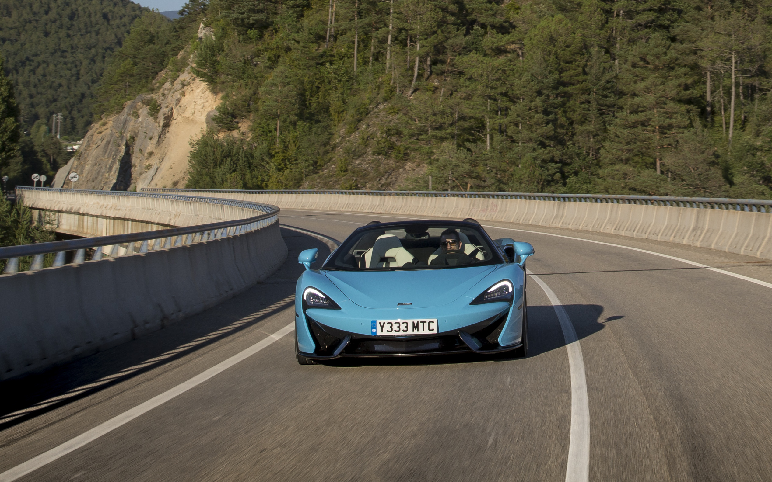 The roof itself isn’t a mere sheet of cloth supported by metal struts, either. It’s a two-piece composite structure, which folds away in a space-saving Z-shape, leaving the open sky over your head, and two rather gorgeous buttresses behind the head rests. It’s not that often that a convertible actually looks better than the coupe on which it’s based, but the 570S Spider pulls it off.