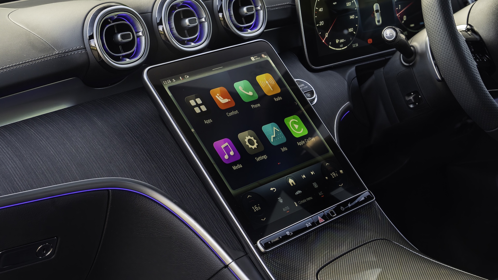 The CLE’s big central touchscreen is really good, with an excellent built-in navigation. While there are no physical buttons for the climate control, the digital ‘buttons’ are always on at the bottom of the screen so they’re easy enough to use.