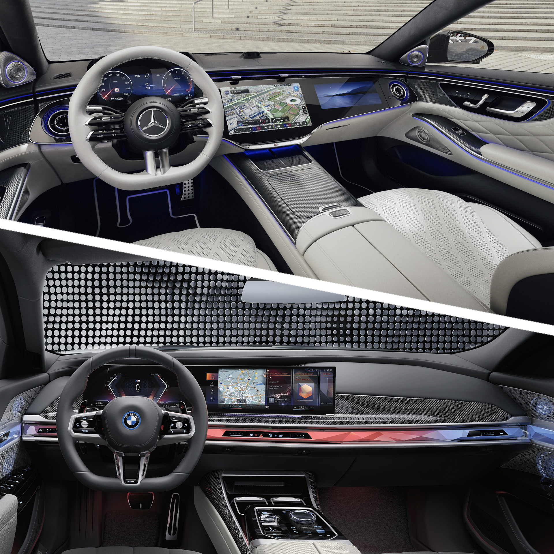 However, a BMW 7 Series may be a better car for enjoying videos, because it’s available with a huge 32.0-inch display which folds down from the ceiling. This makes the two stuck-on tablets in the S-Class look a bit old-school.