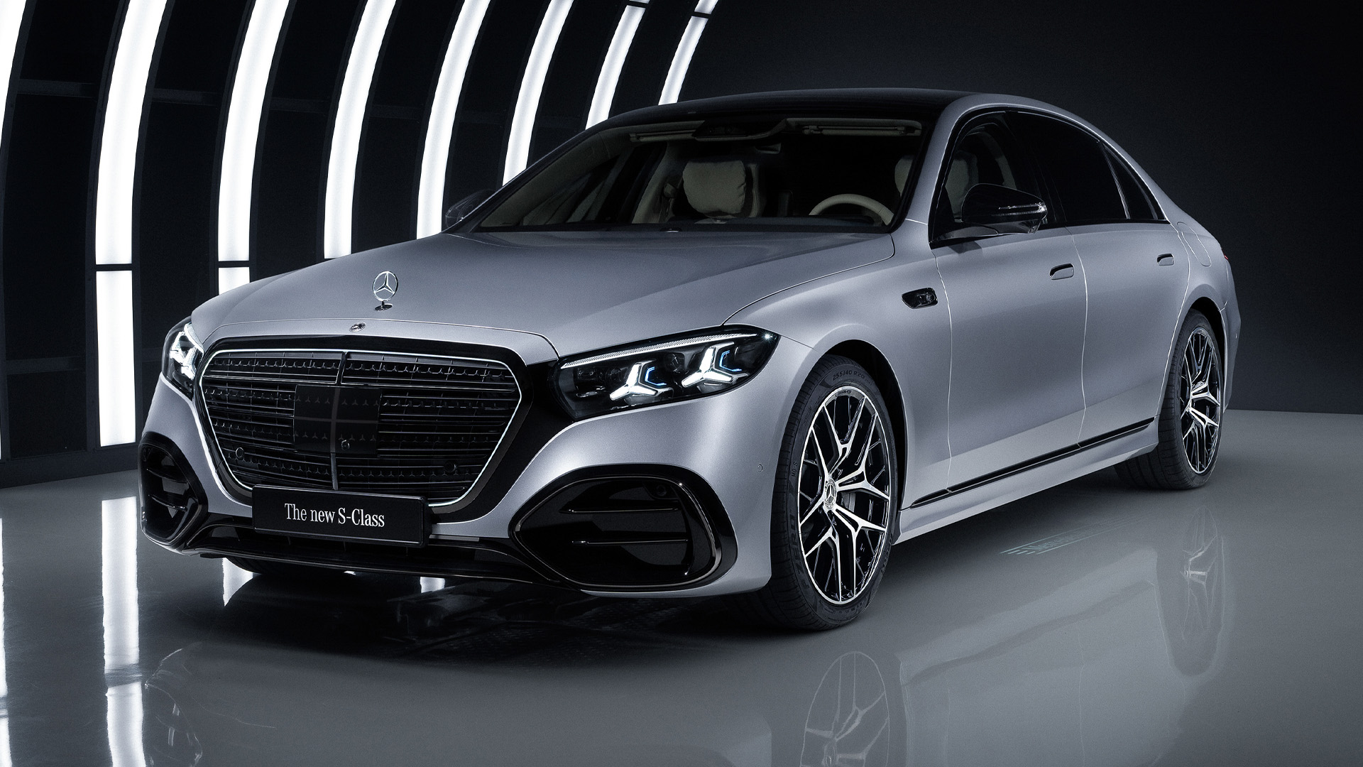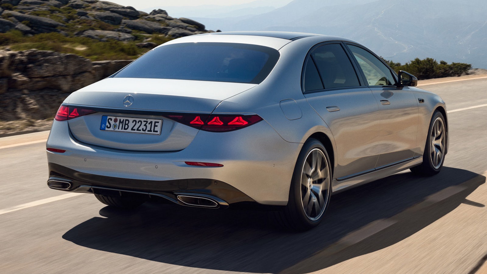 The most obvious difference comes up front with that new grille. It’s 20% larger than the old car’s, and it’s flanked by updated, sleeker LED headlights with star-shaped running lights. The three-pointed star bonnet ornament also lights up, which is a first for the S-Class.