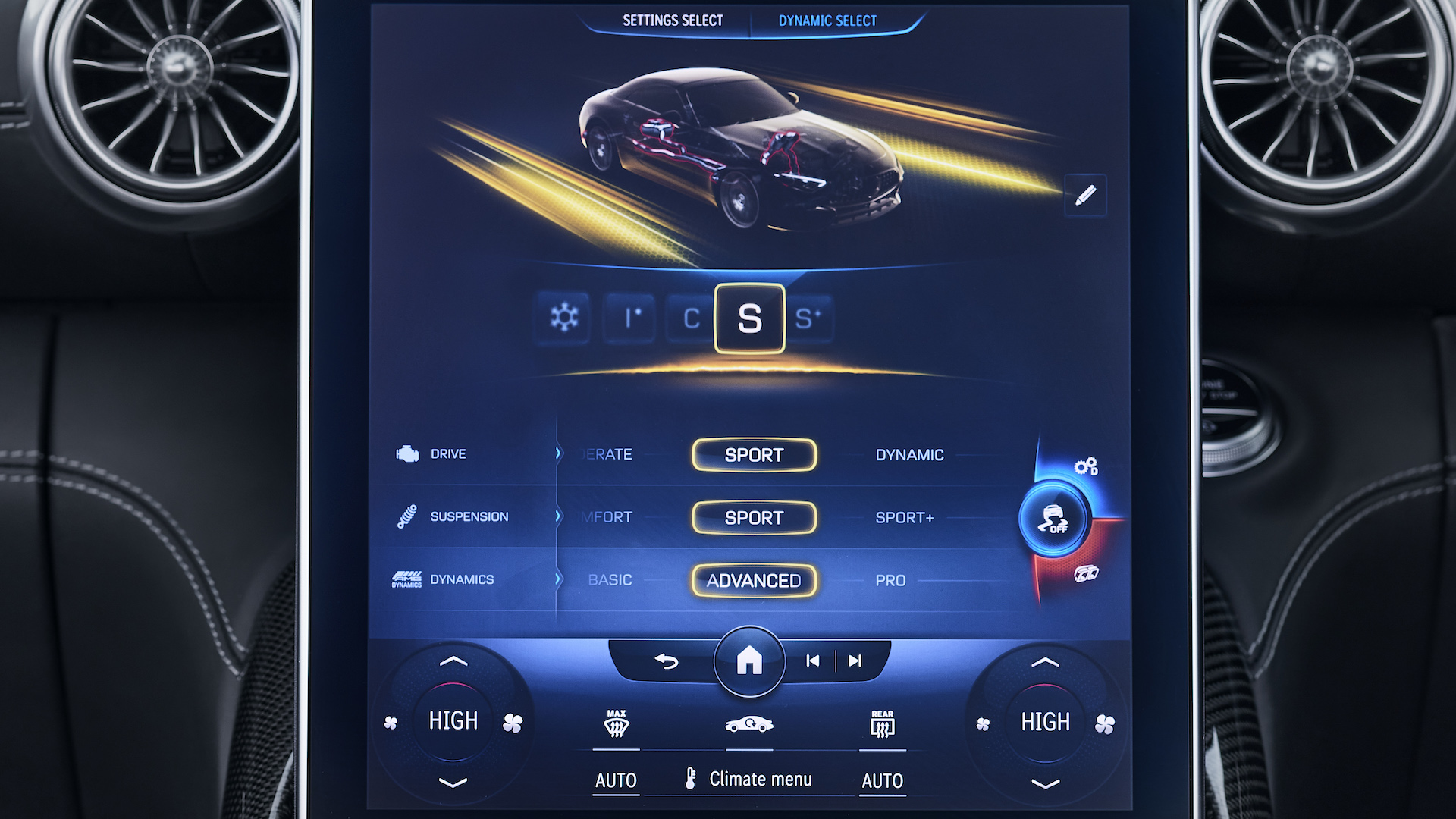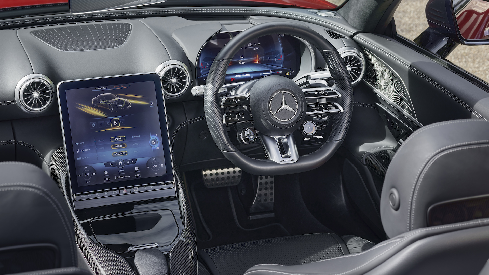 The inside of the SL is almost as dramatic as the outside. Top billing goes to the huge portrait-shaped infotainment system. Borrowed from the latest S-Class, it measures 11.9 inches across. It’s stunning to look at, and you can angle the screen to cut down on glare and make it easier to read.