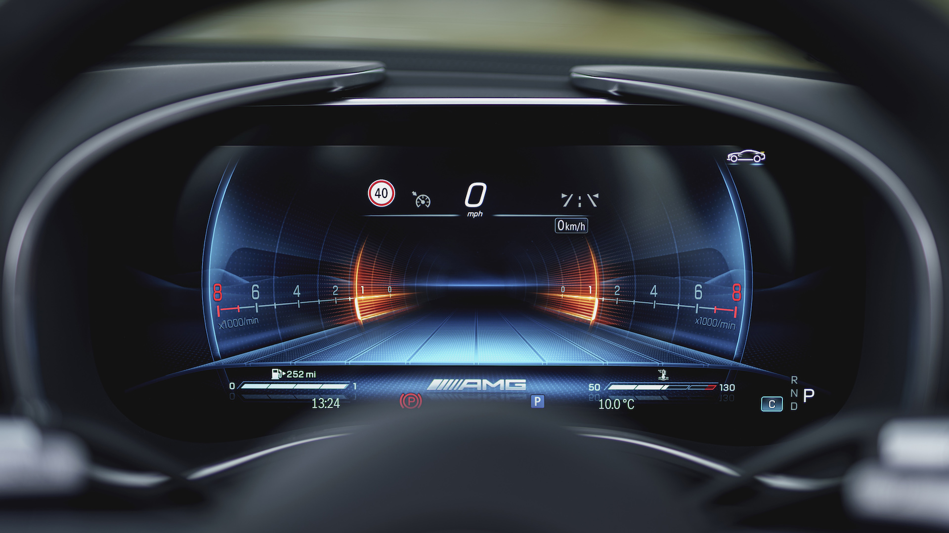 Another digital display straight in front of the driver takes the place of regular dials, and Mercedes has cleverly shaped the dash around it to limit glare and reflections when driving with the roof down. The screen can be configured with different looks and to prioritise different information. Again, the resolution and graphics are stunning, although some of the designs are a bit gimmicky.