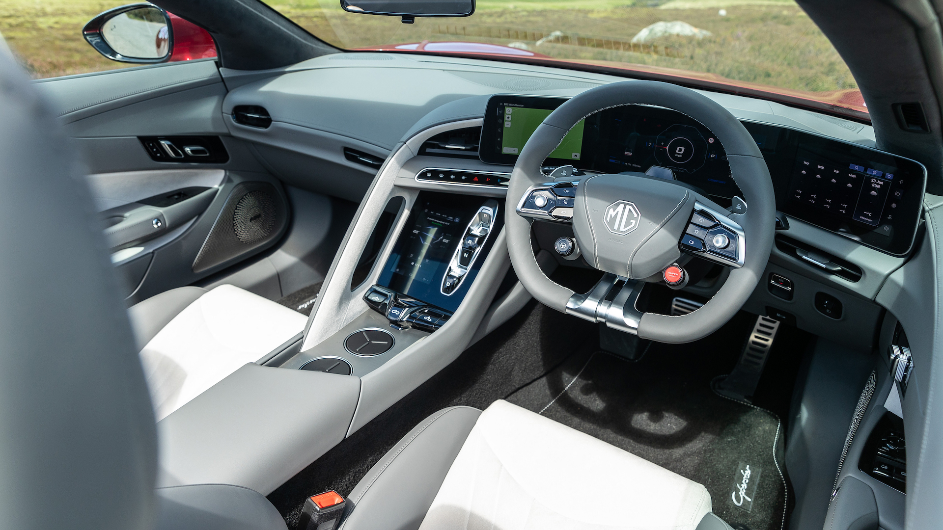 The downside is that the doors can be a little slow at times, especially when you just want to make a quick and discreet getaway, something that becomes kind of impossible in the MG. Once you’re in, you’ll immediately notice a driving position that’s set too high up for comfort or for sportiness, and an incredibly complicated four-screen digital cockpit layout.