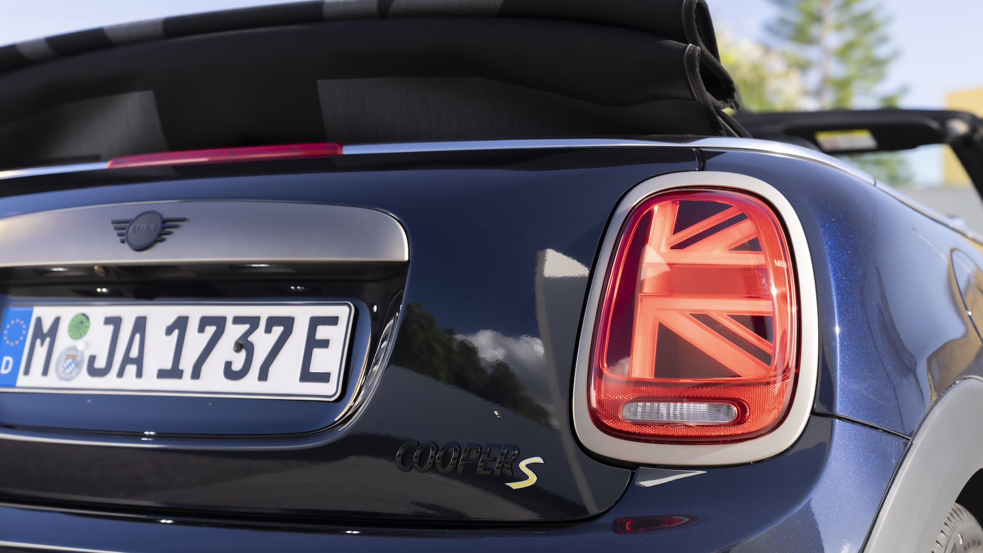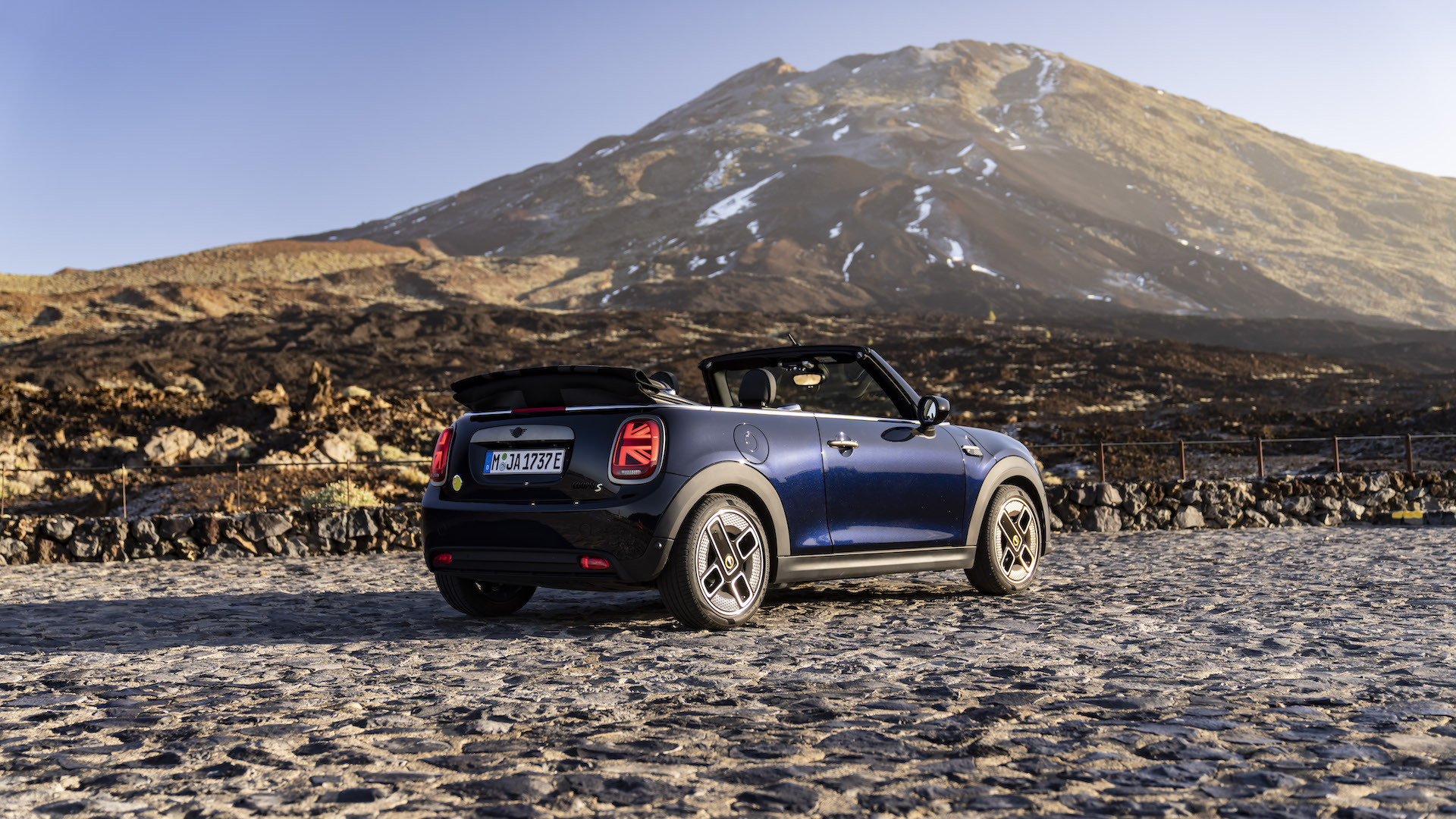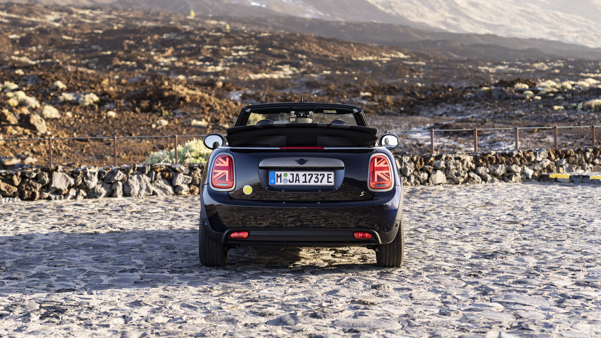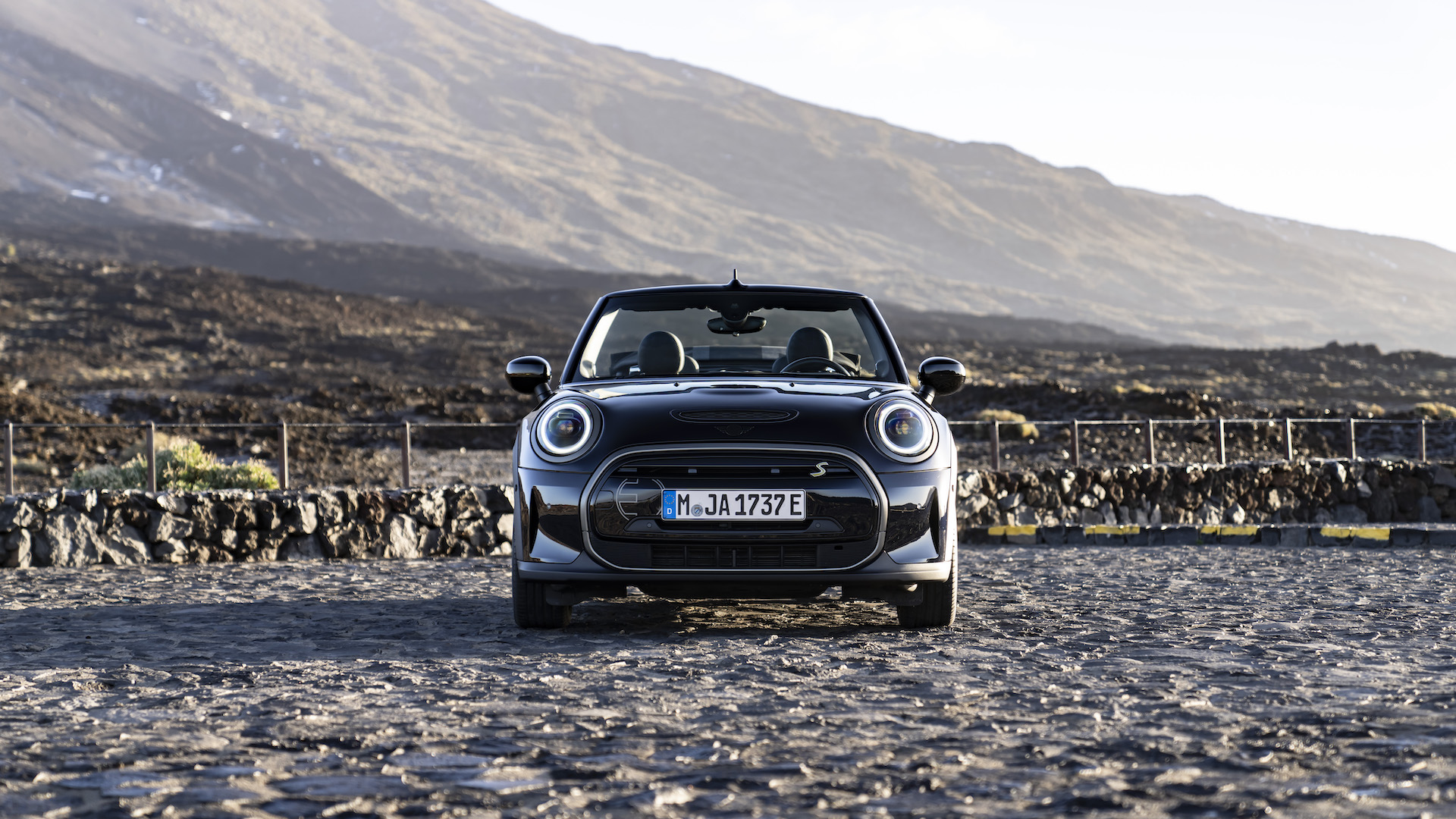 The Mini Electric Convertible is available in one specification, with a choice of two exterior colours: Enigmatic Black or White Silver. The door handles, side scuttles and light surrounds are finished in Resolute Bronze, and the Mini logo and model lettering are in Piano Black.