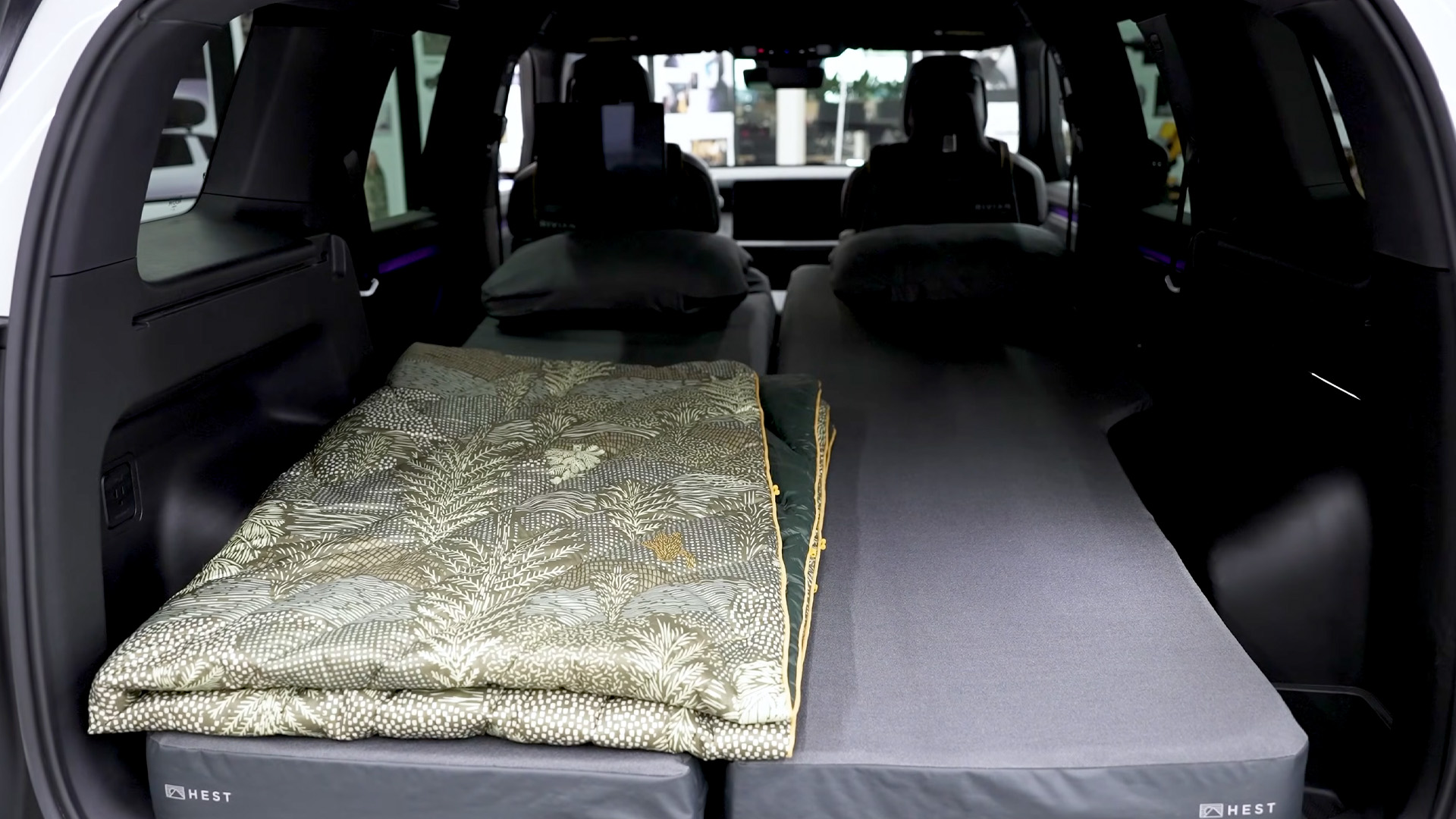 Need to sleep more people? There’s a mattress option for the back seats which perfectly fits the contours of the car. You can even get a duvet set with the same design as the camouflage wrap Rivian used on the R2 prototype.